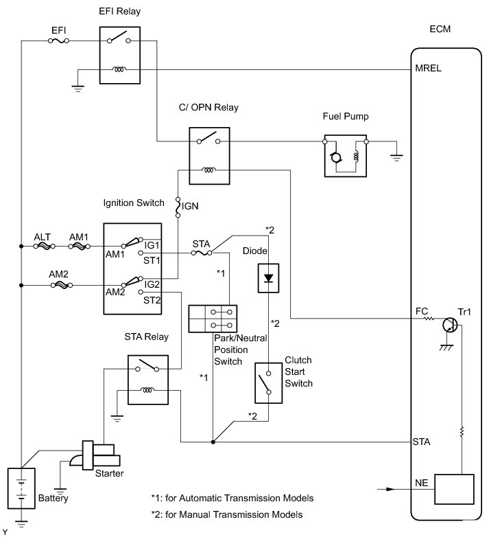 When the STA and NE signals are received by the ECM, Tr (power transistor) is switched on, allowing current to flow into the circuit opening relay coil. The circuit opening relay switches on, power is supplied to the fuel pump and the fuel pump operates.