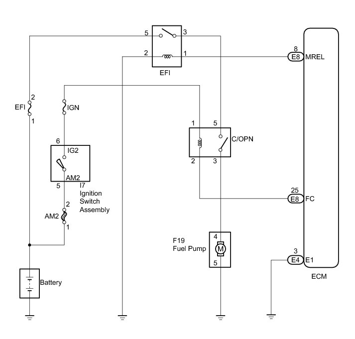 While the NE signal is being generated (engine running), the ECM keeps Tr ON, therefore keeping the circuit opening relay ON, so that the fuel pump continues to operate.