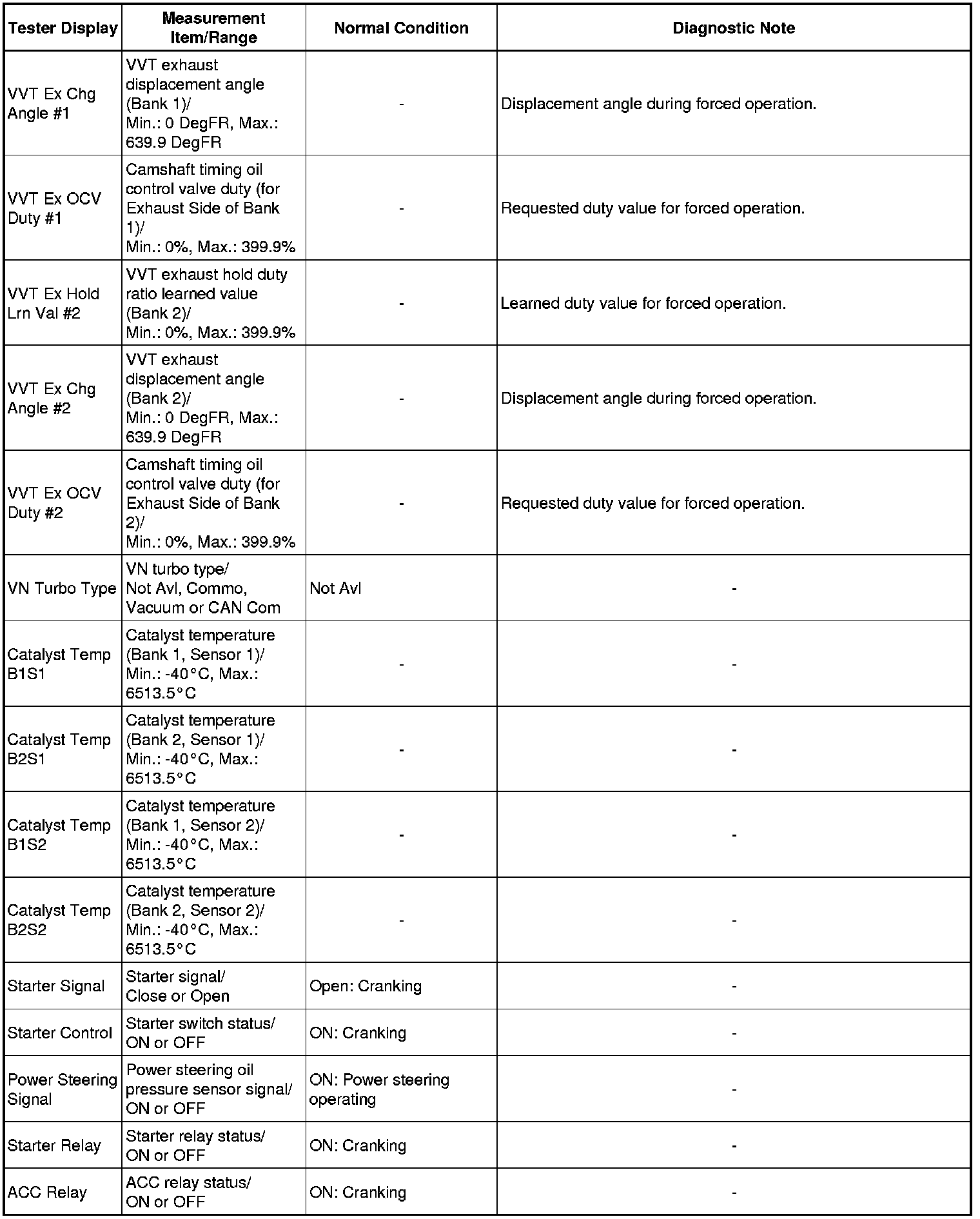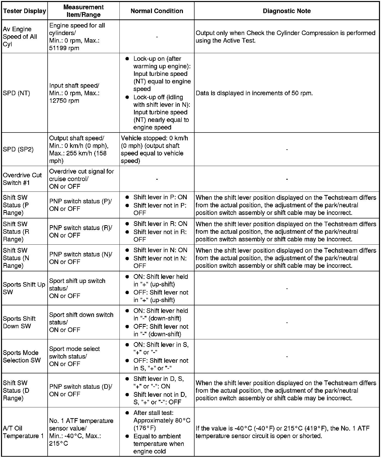Using the Techstream to read the Data List allows the values or states of switches, sensors, actuators and other items to be read without removing any parts. This non-intrusive inspection can be very useful because intermittent conditions or signals may be discovered before parts or wiring is disturbed. Reading the Data List information early in troubleshooting is one way to save diagnostic time.