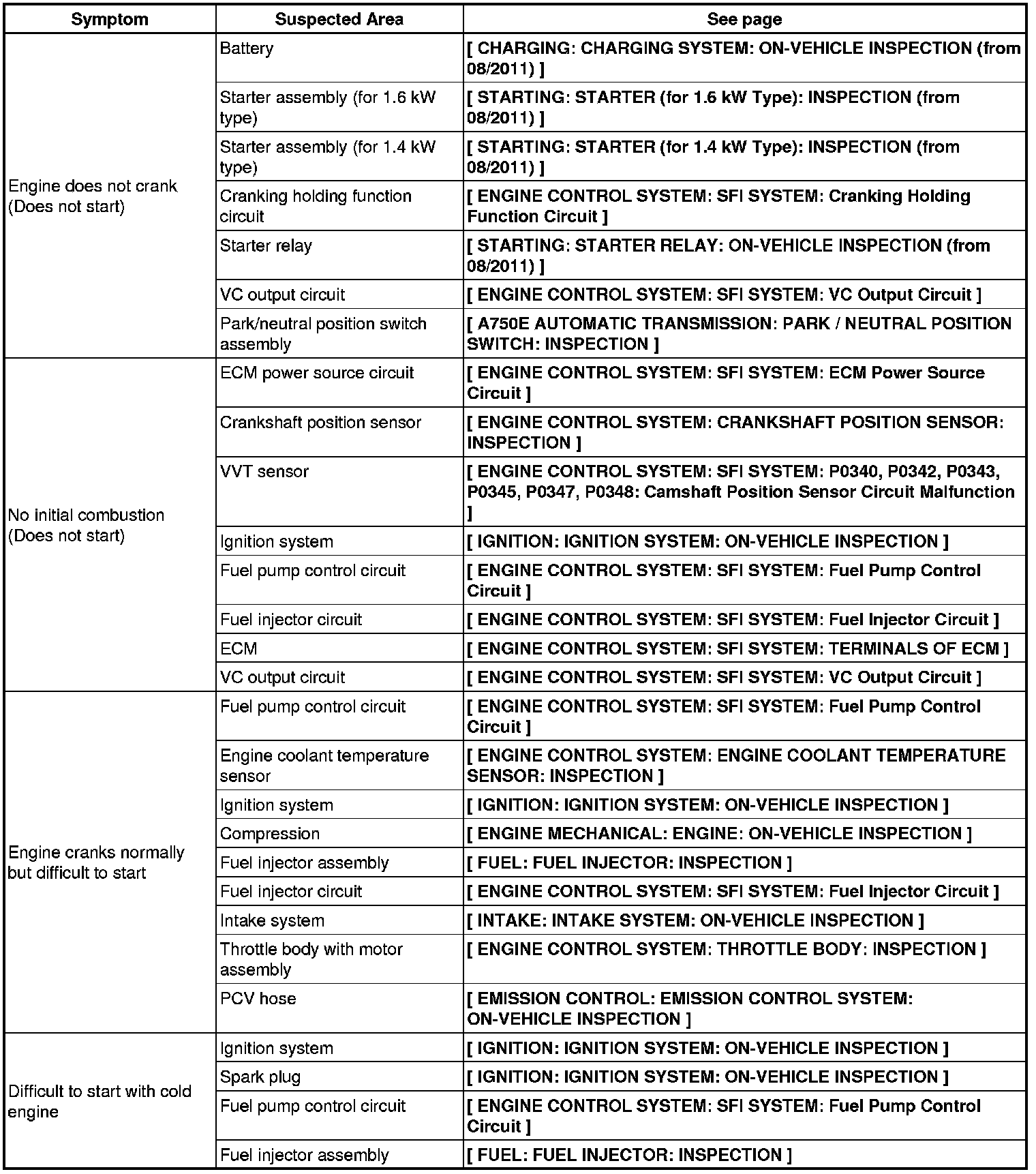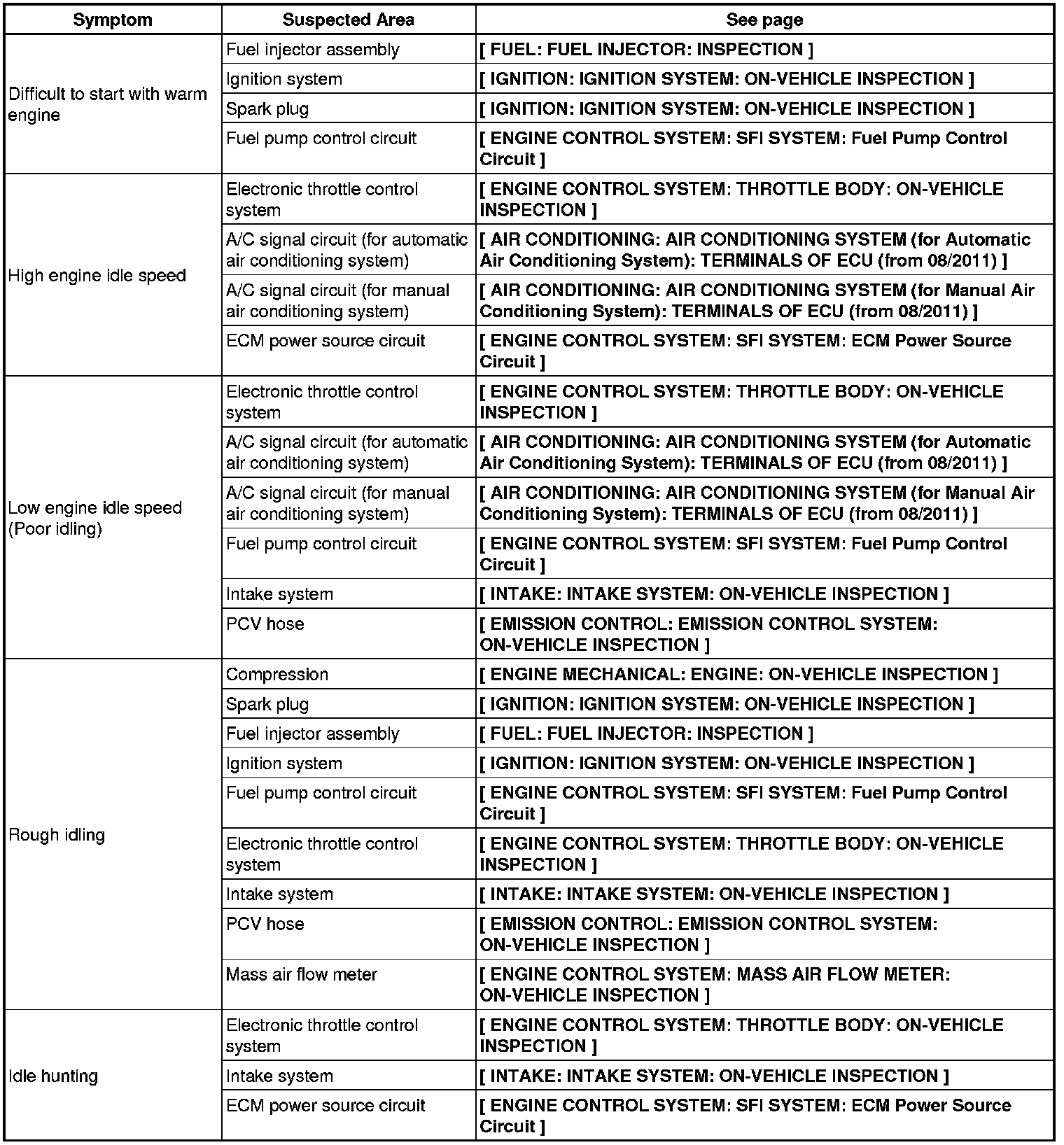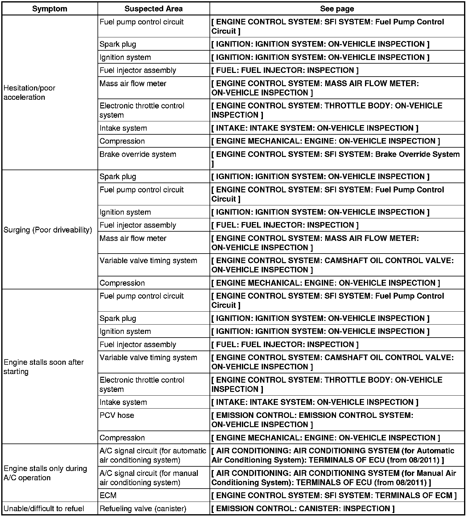 1GR-FE ENGINE CONTROL SYSTEM: SFI SYSTEM: PROBLEM SYMPTOMS TABLE
