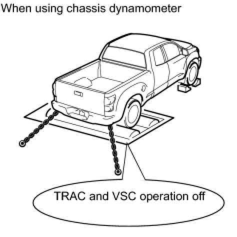 (1) When testing with a 2-wheel drum tester such as a speedometer tester, a combination tester for the speedometer and brake, a chassis dynamometer, enter maintenance mode, or switch to VSC OFF mode to turn TRAC and VSC operation off. Then enter test mode, start the engine and perform measurements.