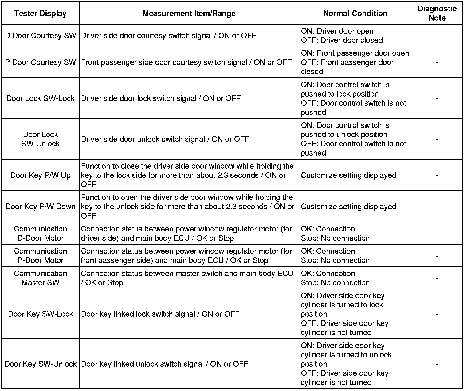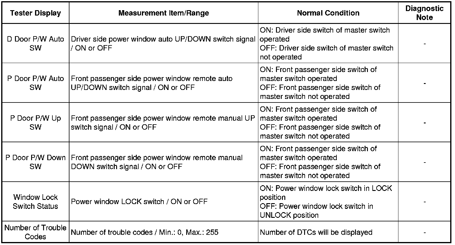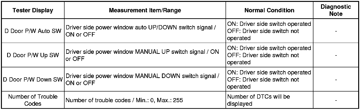 WINDSHIELD / WINDOWGLASS: POWER WINDOW CONTROL SYSTEM (w/ Jam Protection Function): DATA LIST / ACTIVE TEST