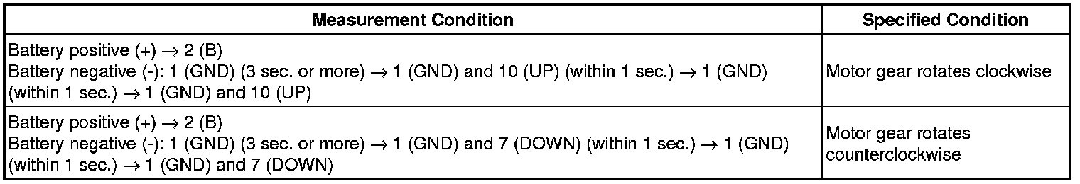(c) Apply negative (-) battery voltage to connector terminals 1 (GND) and 7 (DOWN) / 10 (UP).