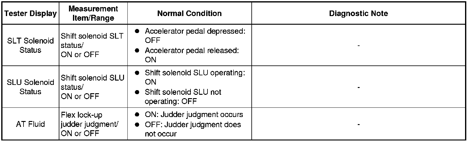*: Activate the Solenoid (SLT) in the Active Test is performed to check the line pressure changes by connecting SST to the automatic transmission, which is used in the Hydraulic Test Hydraulic Test as well. Please note that the pressure values in the Active Test and Hydraulic Test are different.
