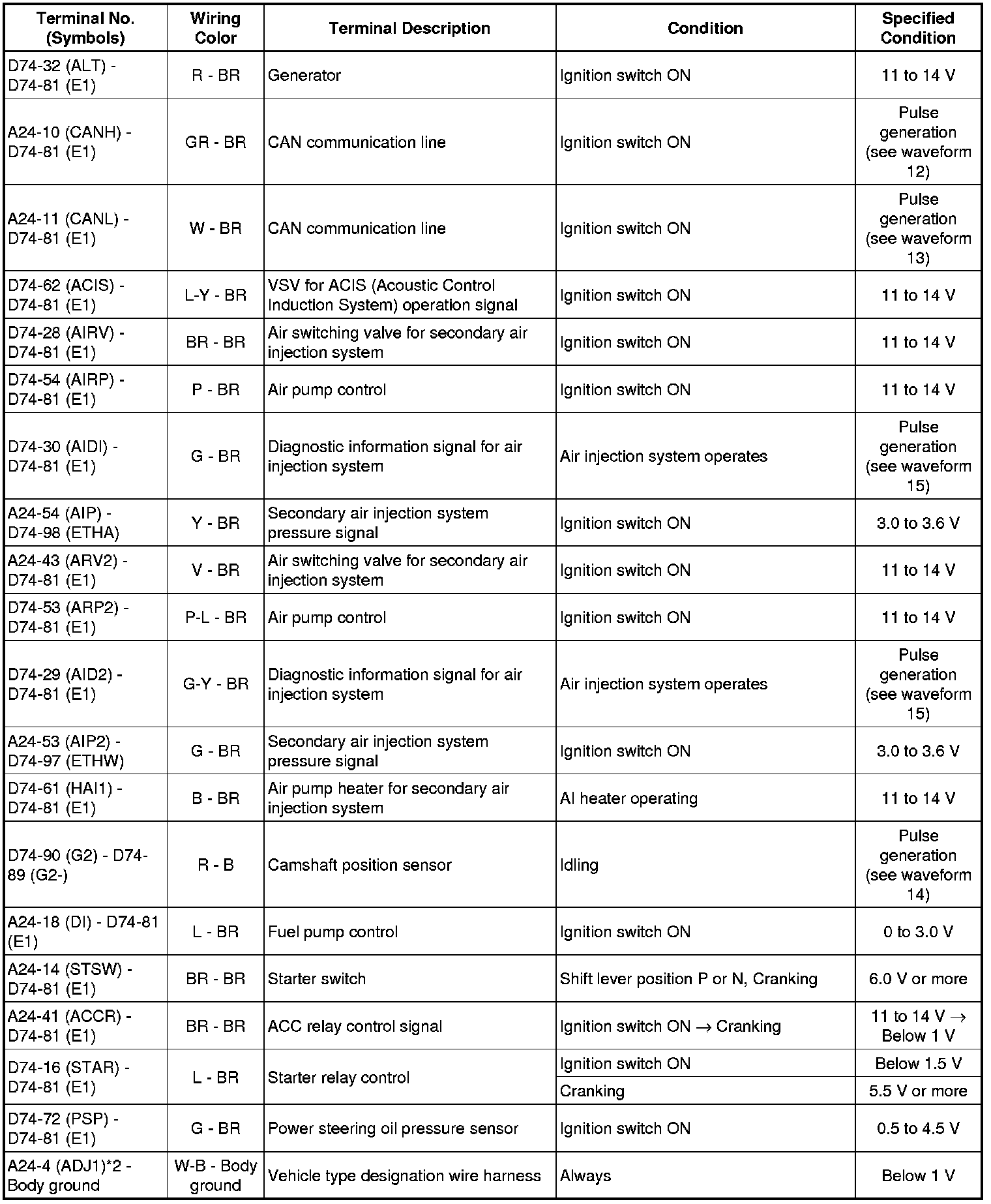The standard normal voltage between each pair of ECM terminals is shown in the table below. The appropriate conditions for checking each pair of terminals are also indicated. The result of checks should be compared with the standard normal voltage for that pair of terminals, displayed in the Specified Condition column. The illustration above can be used as a reference to identify the ECM terminal locations.
