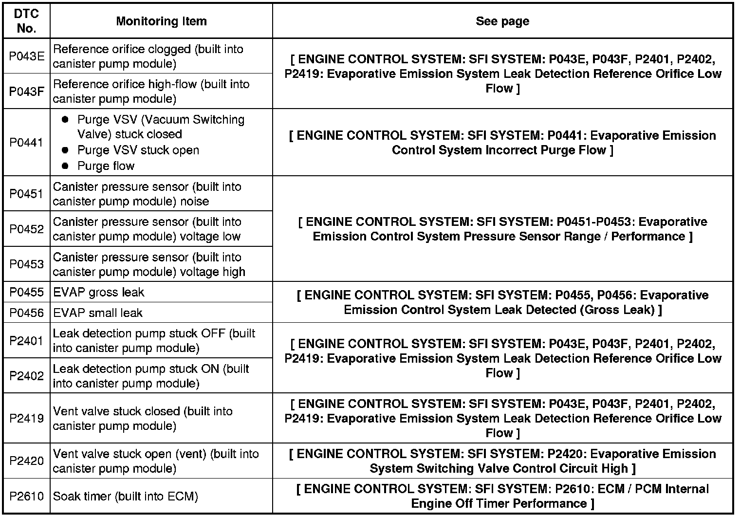 If any EVAP system DTCs are stored, the malfunctioning area can be determined using the table below.