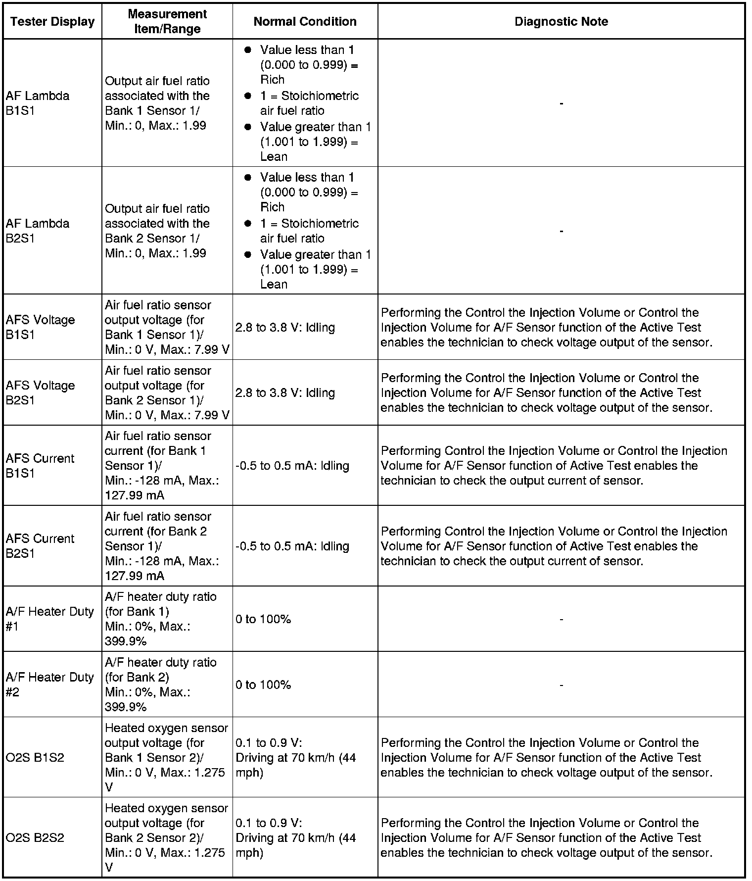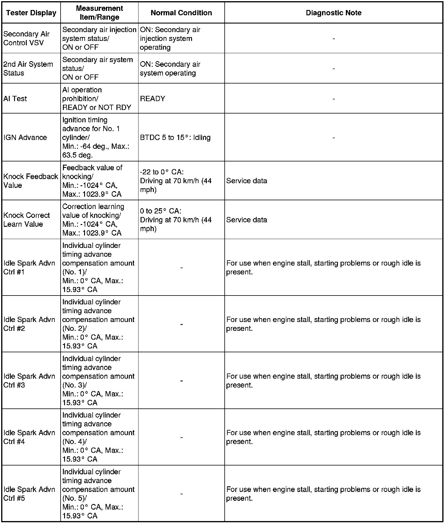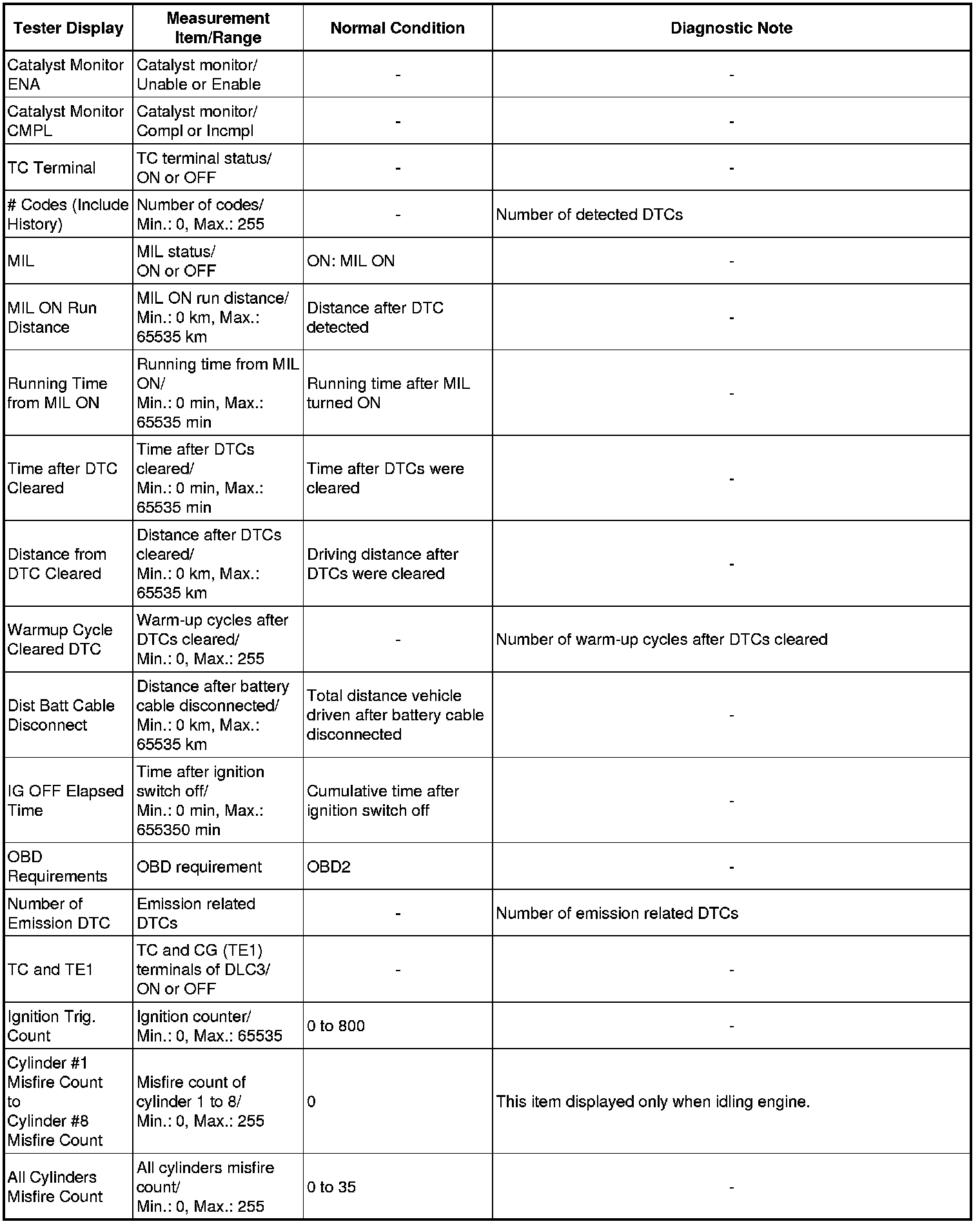 * Normal Condition: If no conditions are specifically stated for "idling", the shift lever should be in N or P, the A/C switch should be OFF, and all accessory switches should be OFF.