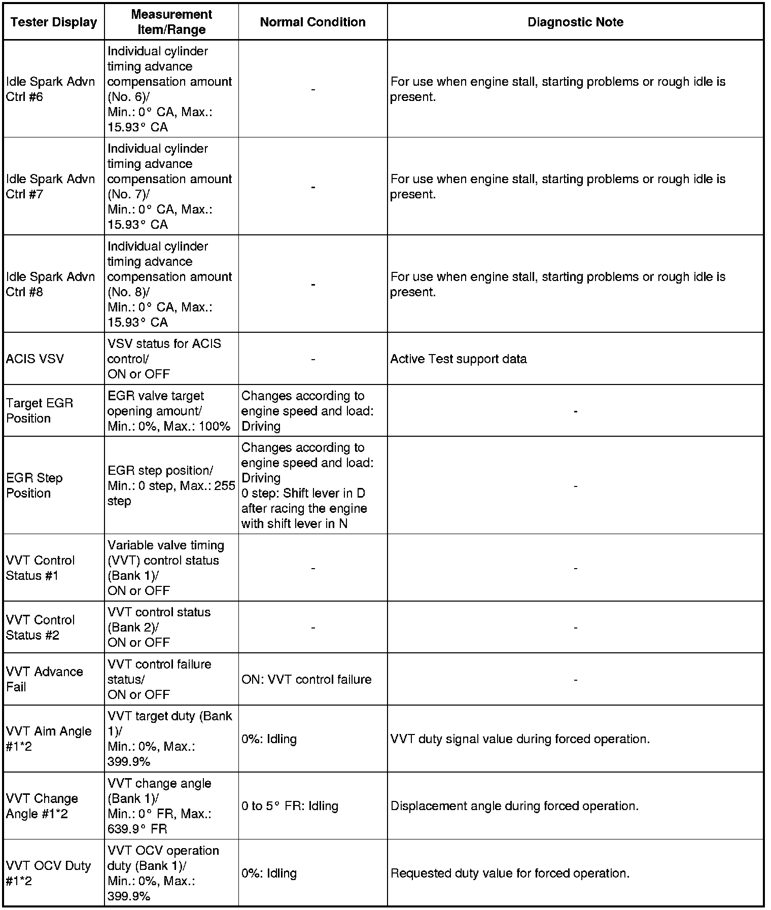 * *2: Data List values are only displayed when performing the following Active test: Control the VVT Linear (Bank 1), Control the VVT Linear (Bank 2), Control the Exhaust Linear (Bank 1) and Control the VVT Exhaust Linear (Bank 2). For other Active test, the Data List value will be 0.