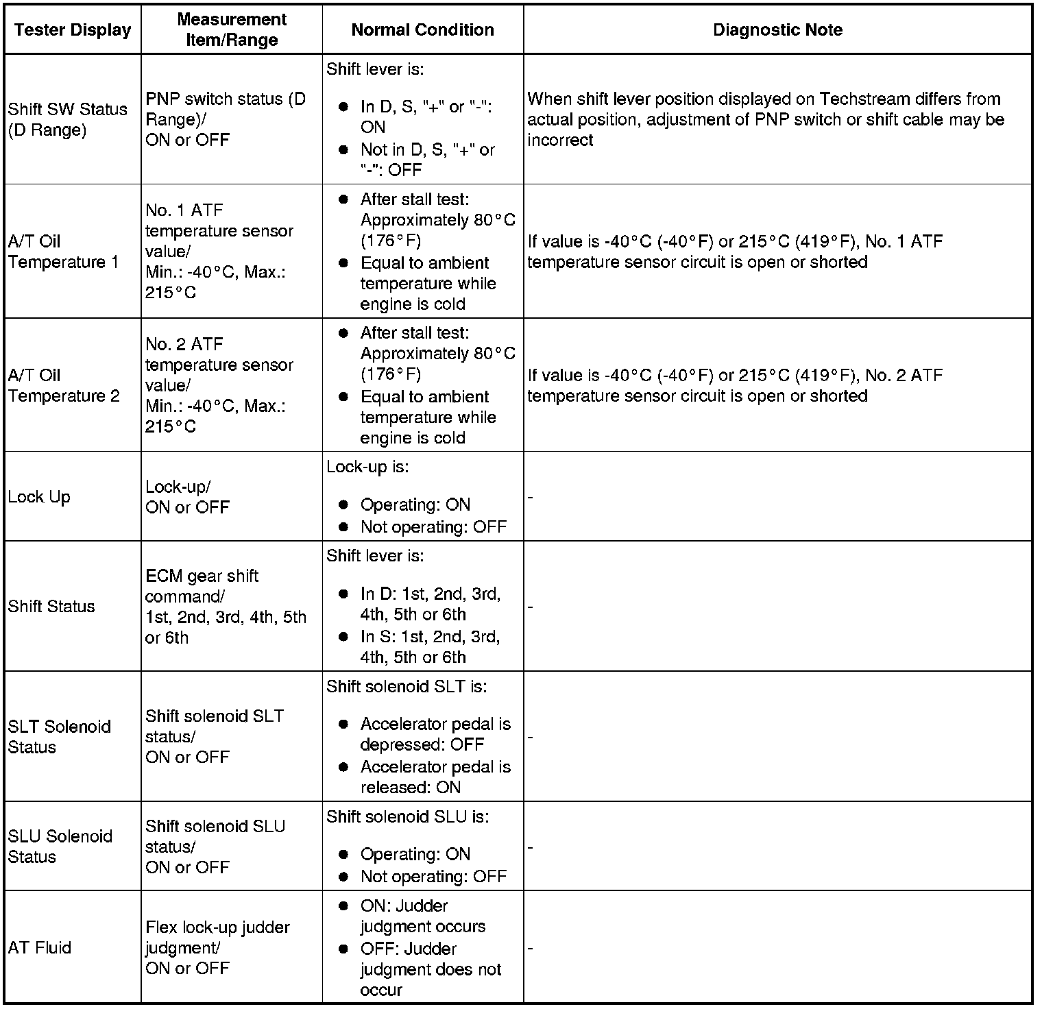 Using the Techstream to read the Data List allows the values or states of switches, sensors, actuators and other items to be read without removing any parts. This non-intrusive inspection can be very useful because intermittent conditions or signals may be discovered before parts or wiring is disturbed. Reading the Data List information early in troubleshooting is one way to save diagnostic time.