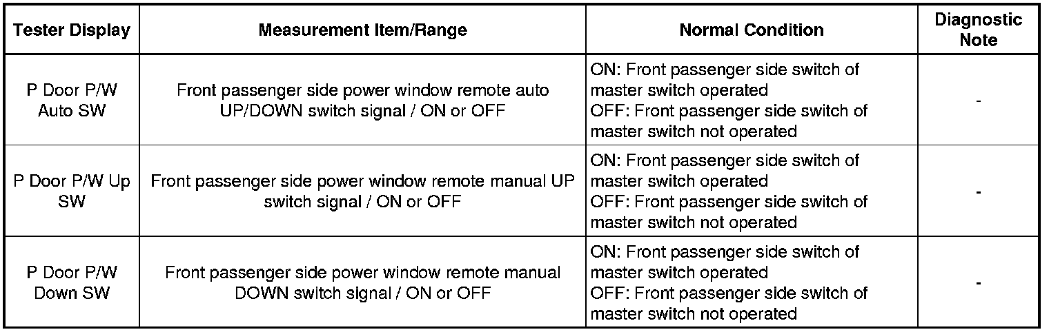 When the ignition switch is ON and the window lock switch is OFF, the master switch sends remote UP/DOWN signals to the front passenger side motor via the LIN communication line.