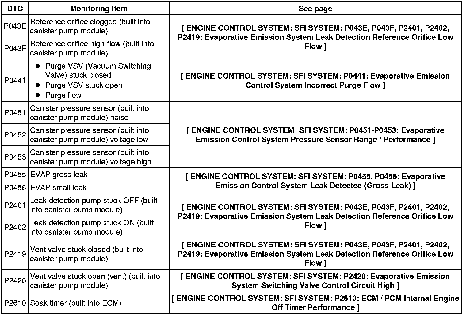 The leak detection pump creates negative pressure (vacuum) in the EVAP system and the pressure is measured. Finally, the ECM monitors for leaks from the EVAP system, and malfunctions in both the canister pump module and purge VSV, based on the EVAP pressure.