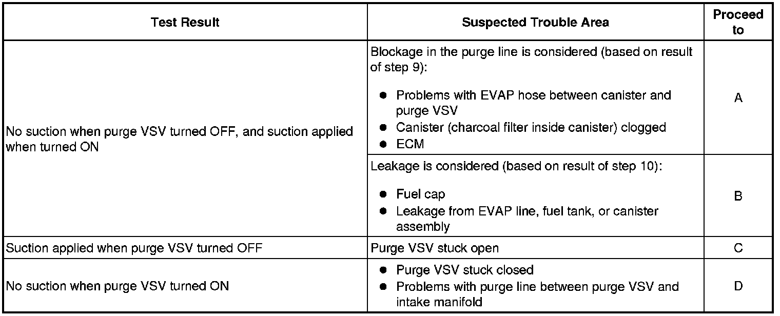 If any EVAP system DTCs are set, the malfunctioning area can be determined using the table below.