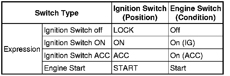 (a) The type of ignition switch used on this model differs according to the specifications of the vehicle. The expressions listed in the table below are used in this section.