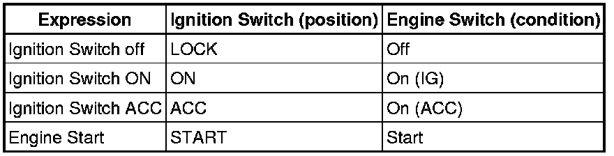 The type of ignition switch used on this model differs according to the specifications of the vehicle. The expressions listed in the table below are used in this section.