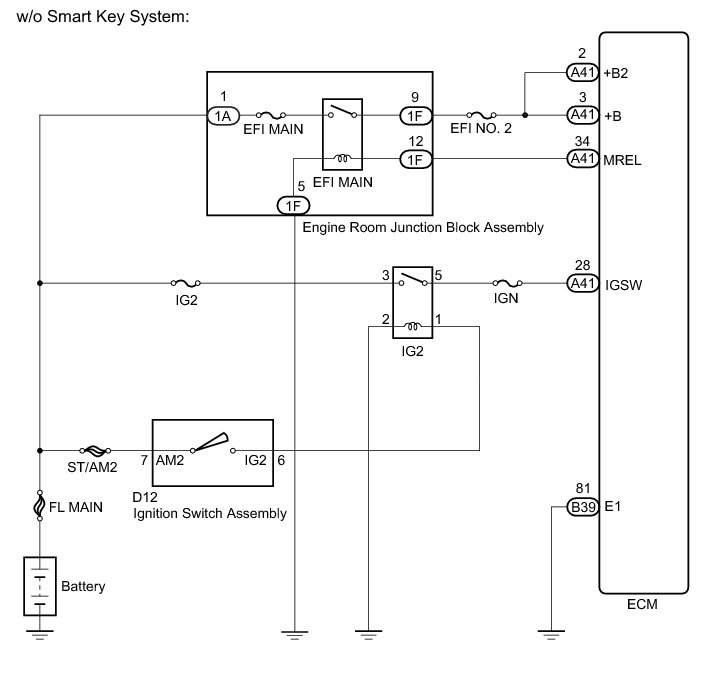 When the ignition switch is turned to ON, the battery voltage is applied to IGSW of the ECM. The output signal from the MREL terminal of the ECM causes a current to flow to the coil, closing the contact of the engine room junction block assembly (EFI MAIN relay) and supplying power to terminals +B and +B2 of the ECM.