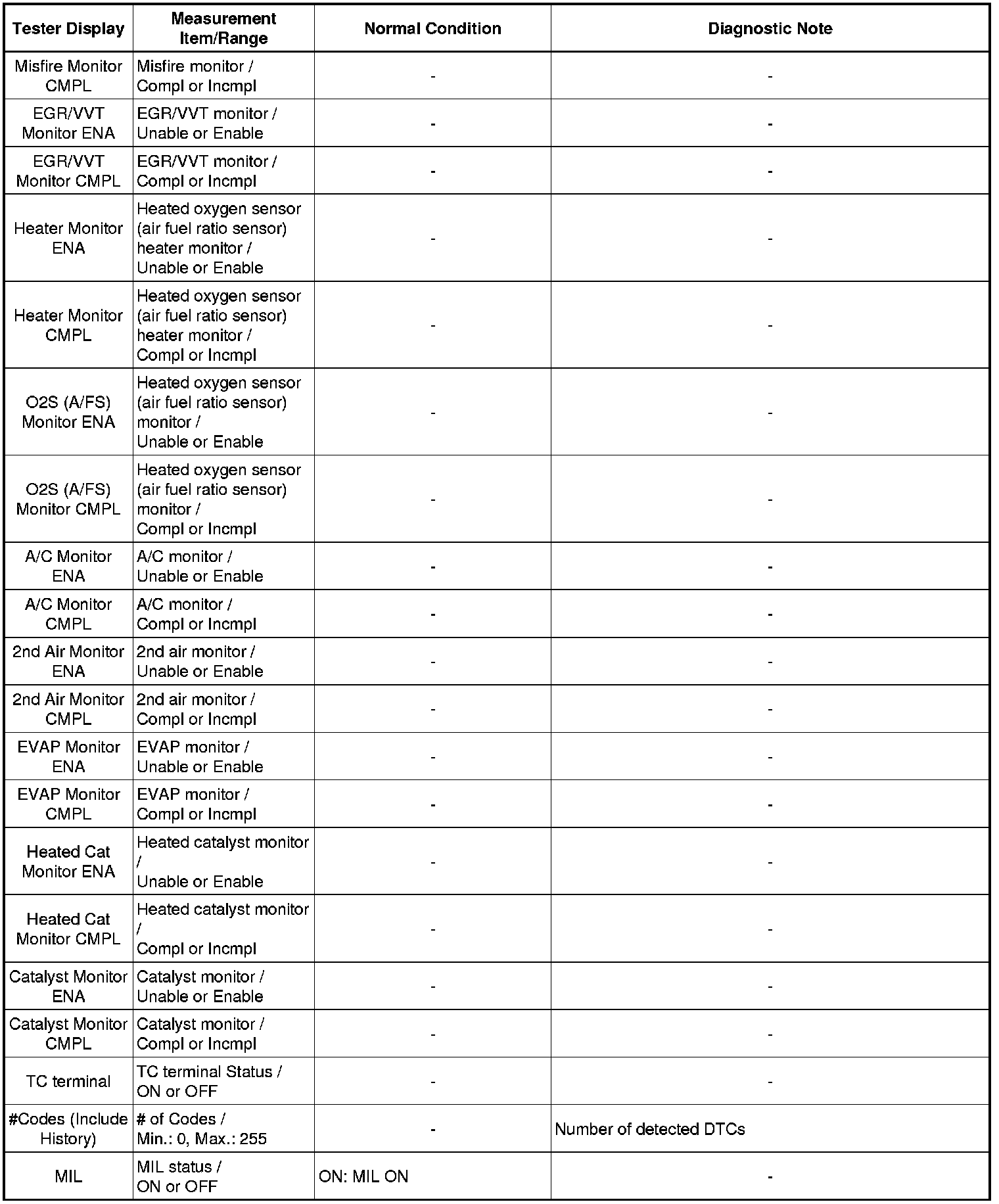 Using the Techstream to read the Data List allows the values or states of switches, sensors, actuators and other items to be read without removing any parts. This non-intrusive inspection can be very useful because intermittent conditions or signals may be discovered before parts or wiring is disturbed. Reading the Data List information early in troubleshooting is one way to save diagnostic time.