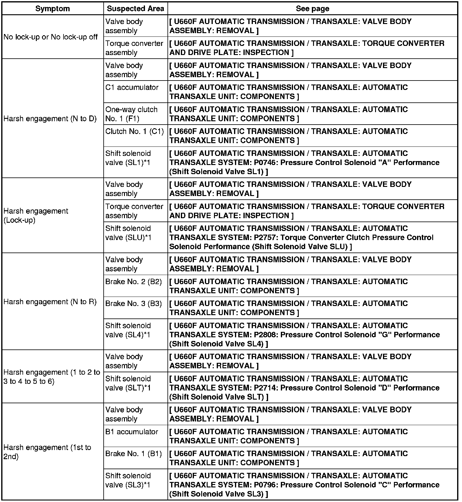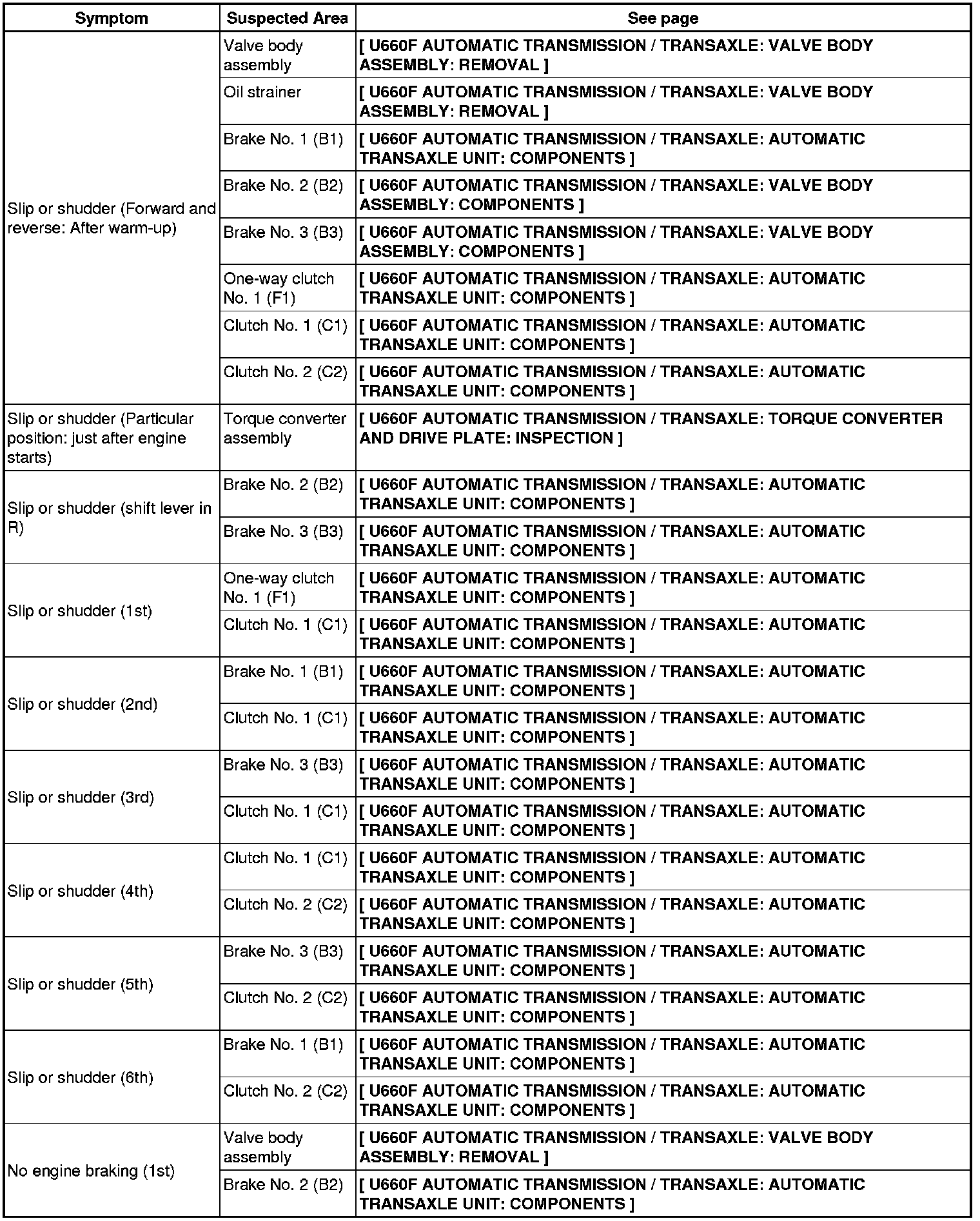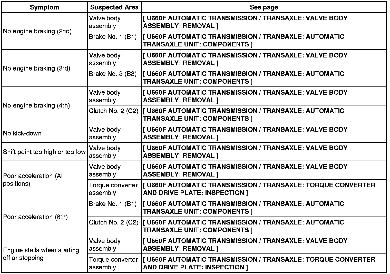 U660F AUTOMATIC TRANSMISSION / TRANSAXLE: AUTOMATIC TRANSAXLE SYSTEM: PROBLEM SYMPTOMS TABLE