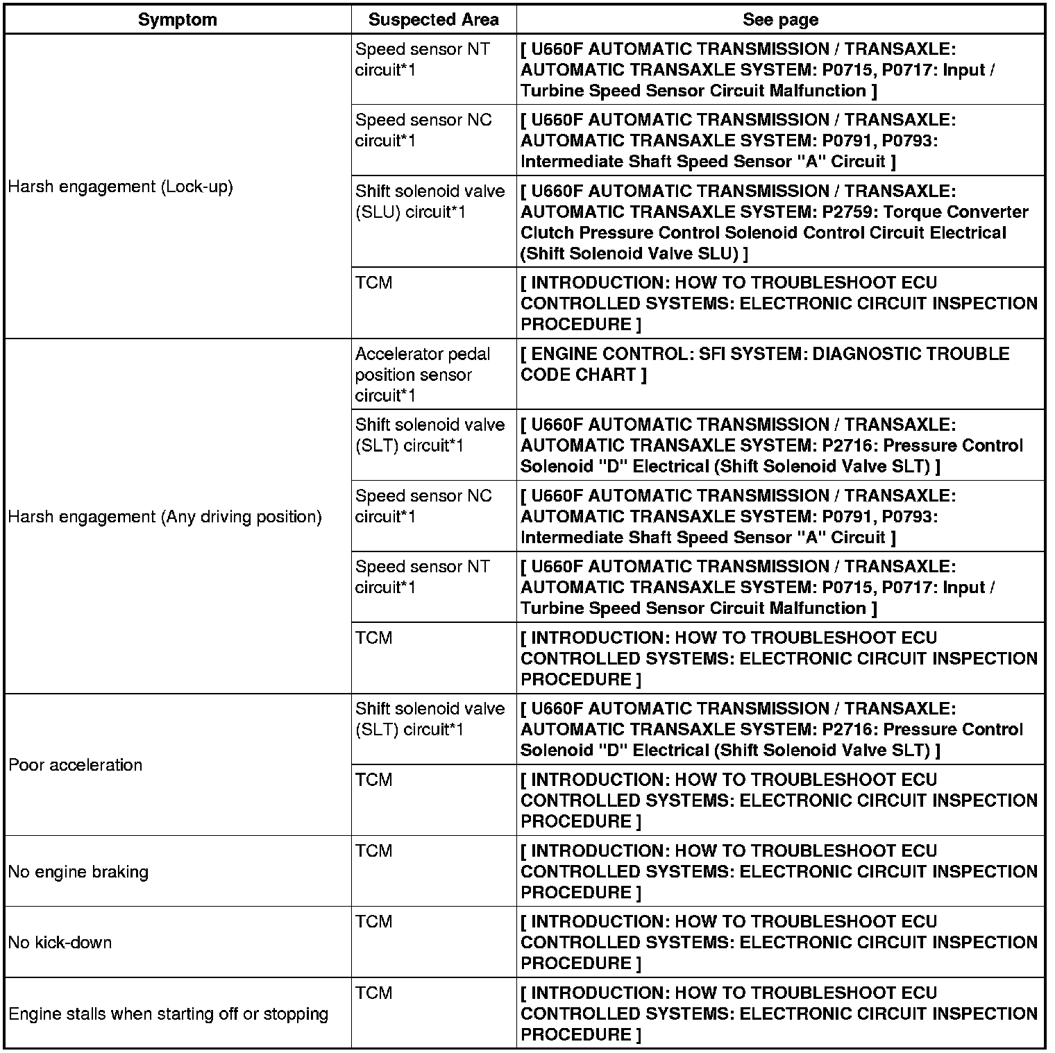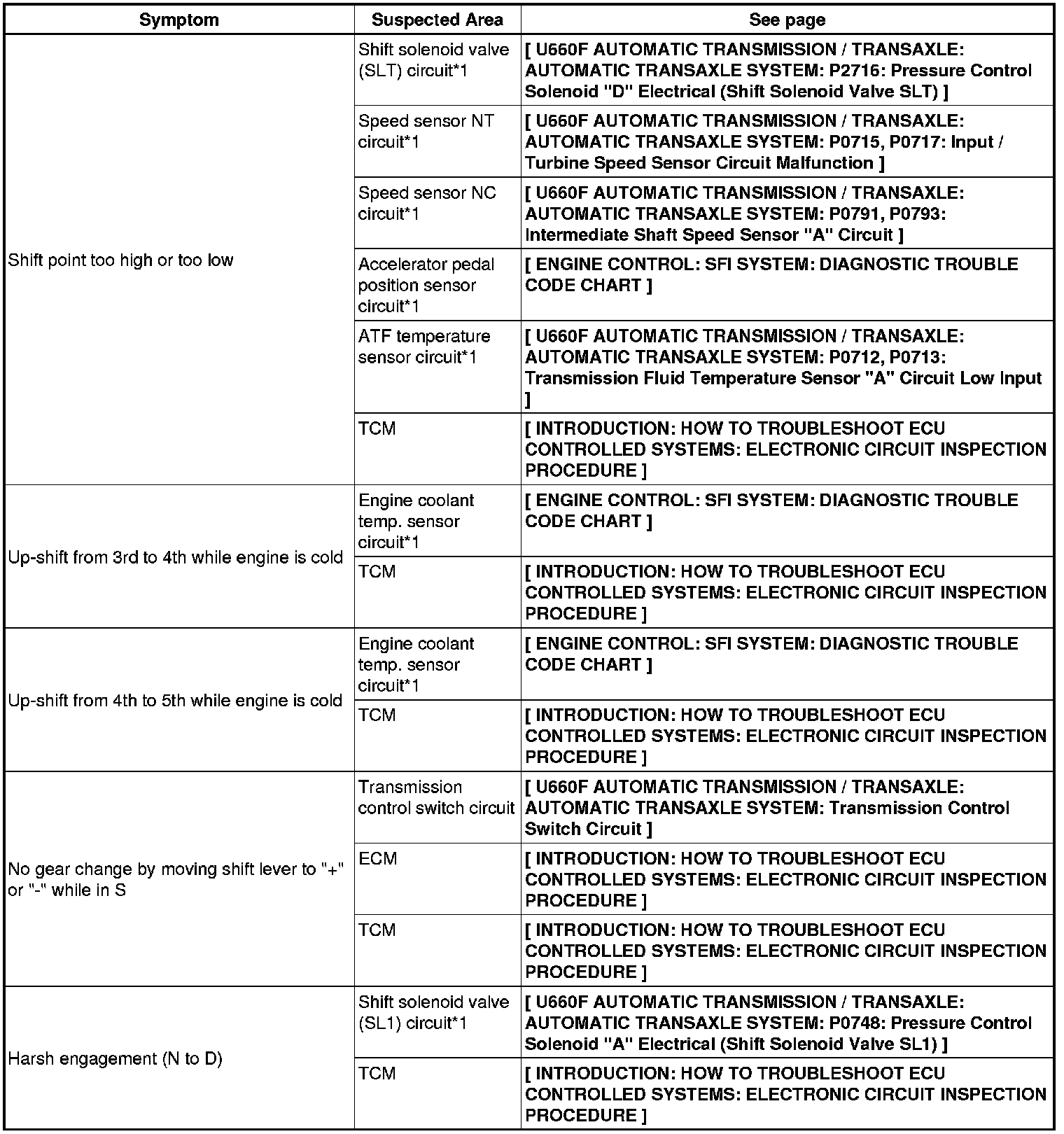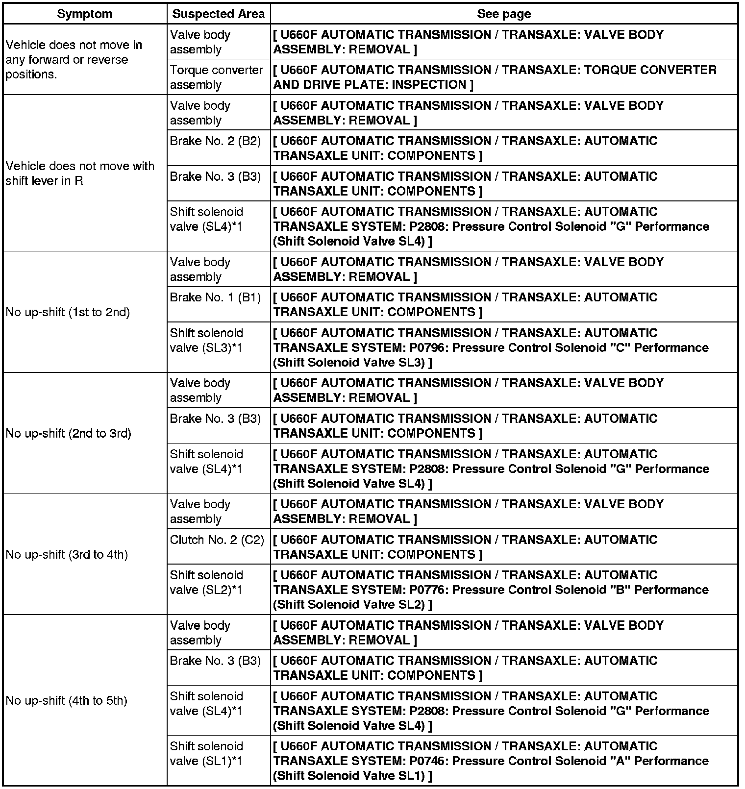 U660F AUTOMATIC TRANSMISSION / TRANSAXLE: AUTOMATIC TRANSAXLE SYSTEM: PROBLEM SYMPTOMS TABLE