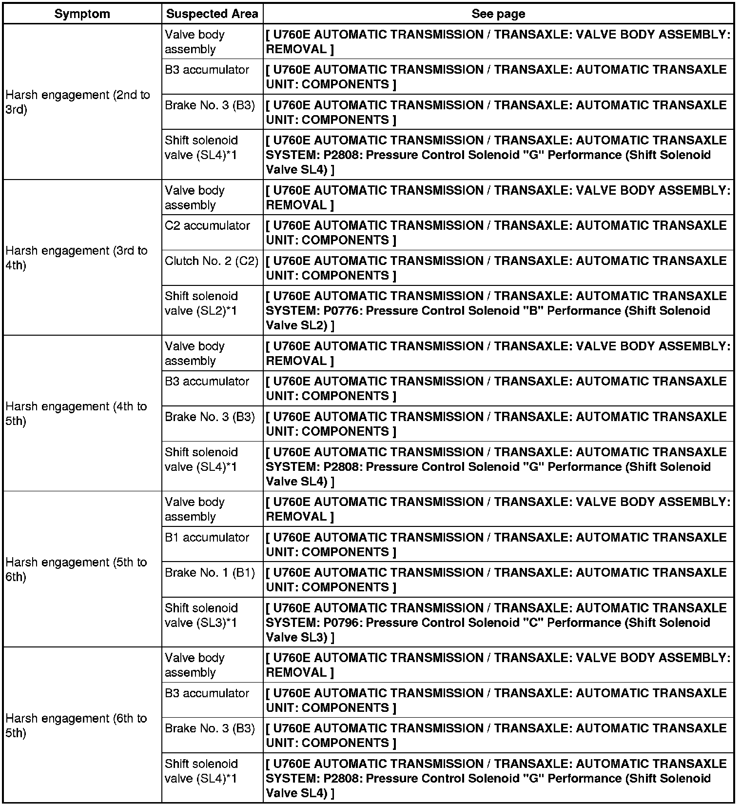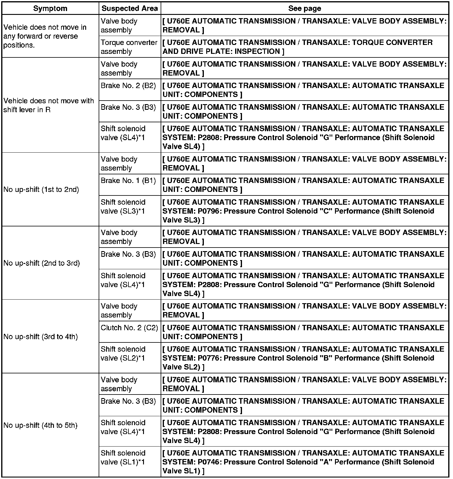 U760E AUTOMATIC TRANSMISSION / TRANSAXLE: AUTOMATIC TRANSAXLE SYSTEM: PROBLEM SYMPTOMS TABLE