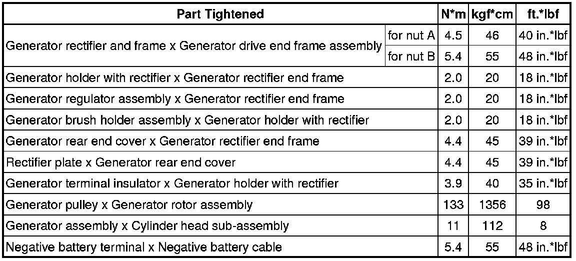 SPECIFICATIONS: 1NZ-FE BATTERY / CHARGING (for Hatchback): TORQUE SPECIFICATIONS
