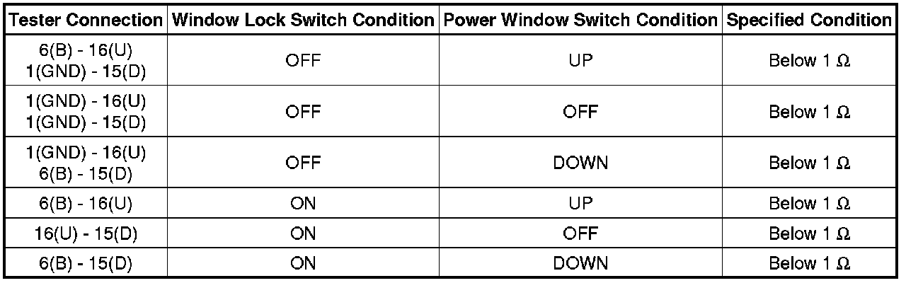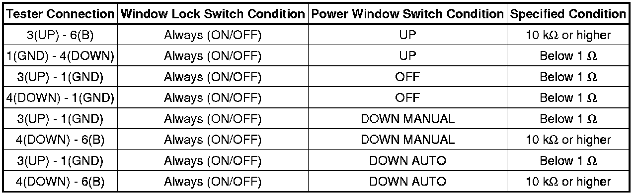 If the result is not as specified, replace the power window regulator master switch assembly.