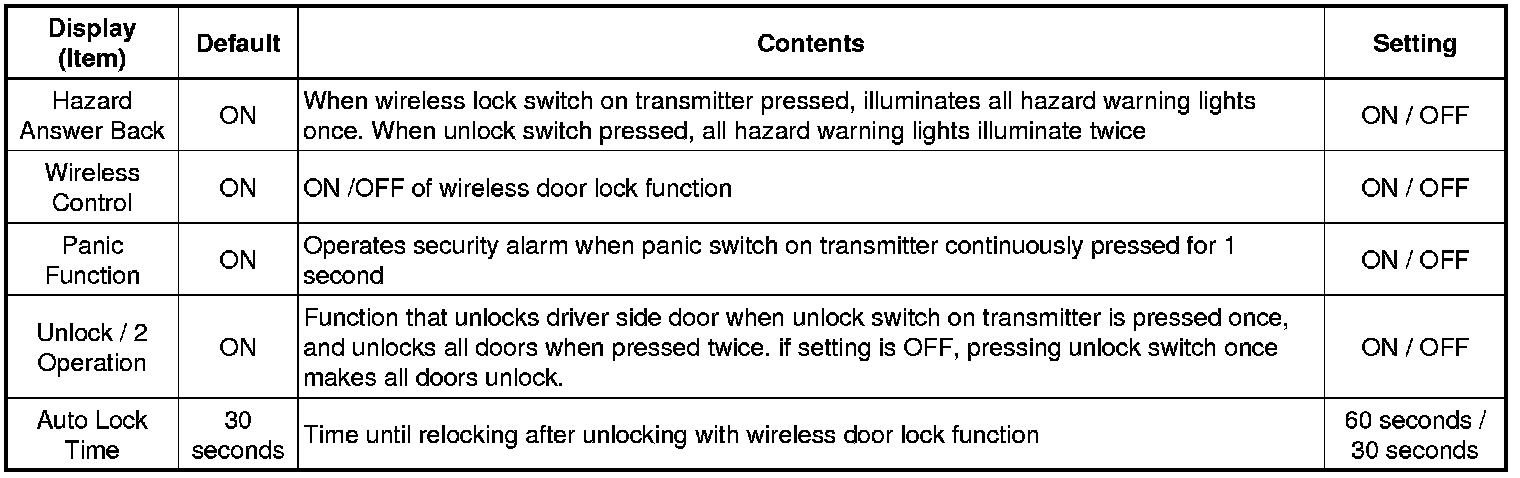 DOOR LOCK: WIRELESS DOOR LOCK CONTROL SYSTEM (for Sedan): CUSTOMIZE PARAMETERS
