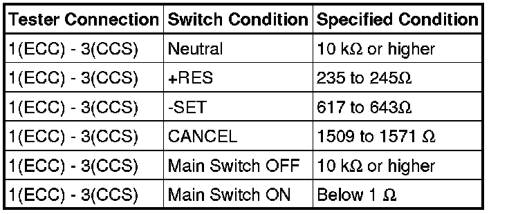 If the result is not as specified, replace the cruise control main switch.