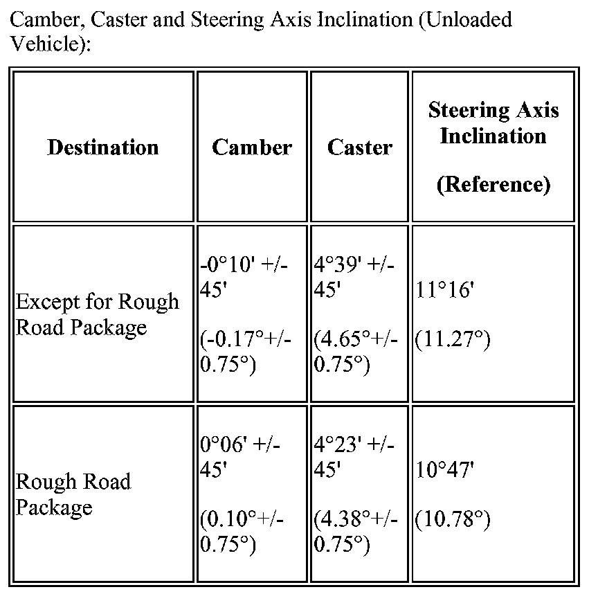 - The tolerance for the difference between the left and right wheels is 0° 30° (0.5°) or less for both the camber and caster.