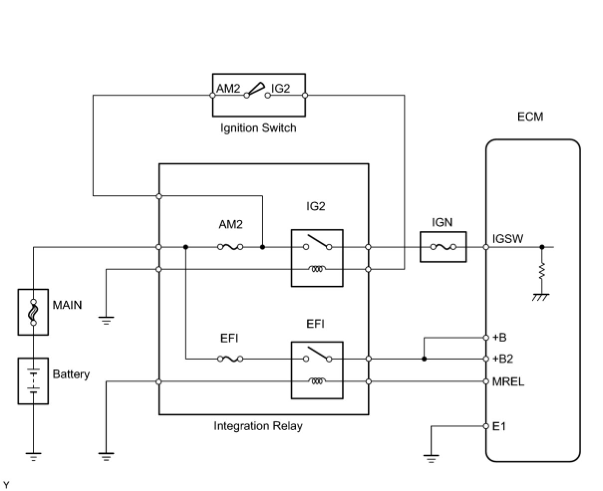When the ignition switch is turned to ON, the battery voltage is applied to the IGSW of the ECM. The output signal from the MREL terminal of the ECM causes a current to flow to the coil, closing the contacts of the integration relay (EFI relay) and supplying power to terminals +B and +B2 of the ECM.