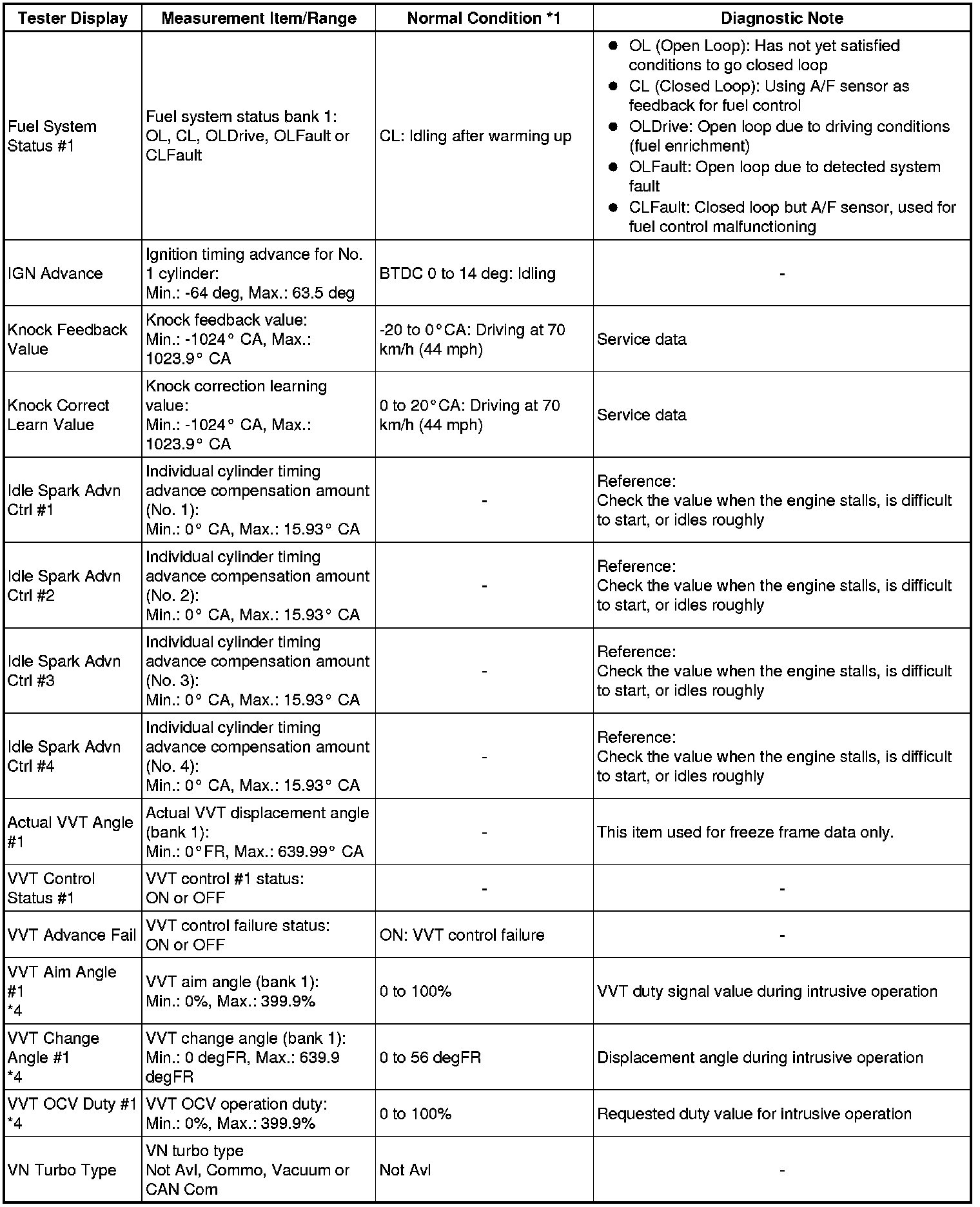 * *3: Data List values are only displayed when performing the following Active Tests: Control the VVT Linear (Bank1), and Control the VVT System (Bank1). For other Active Tests, the Data List value will be 0.