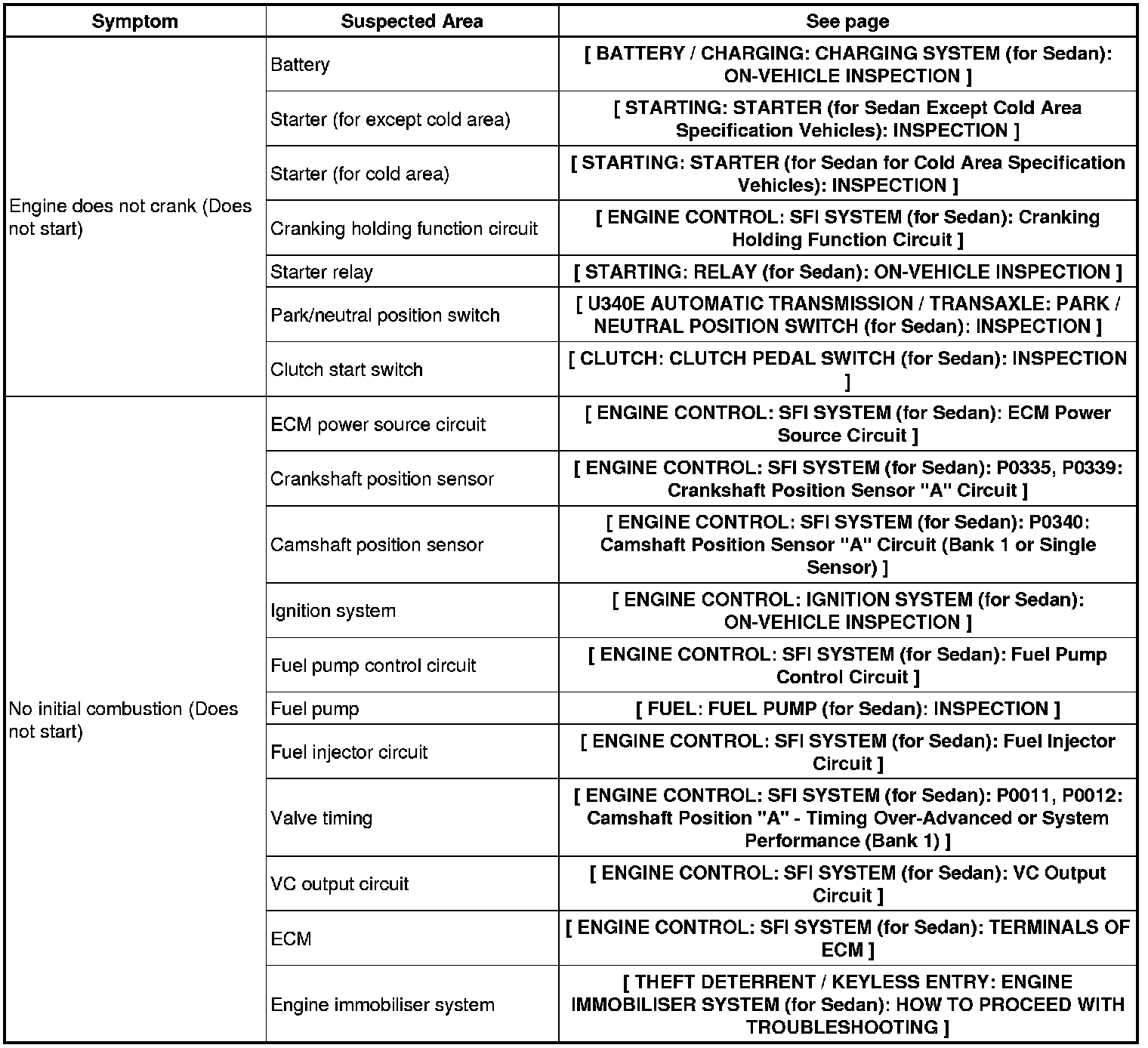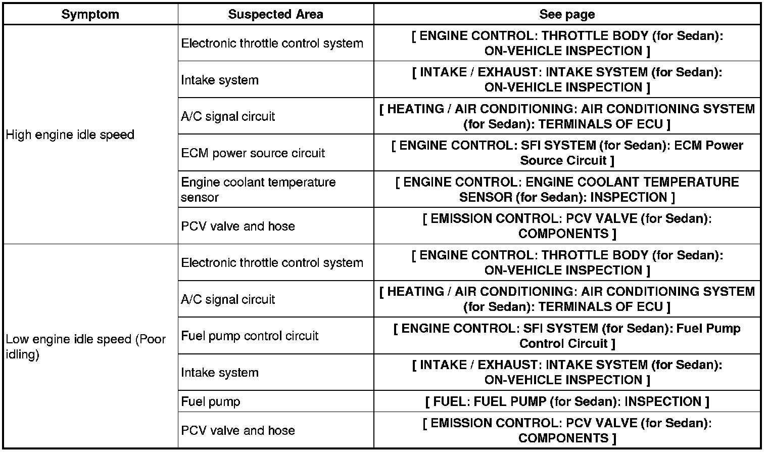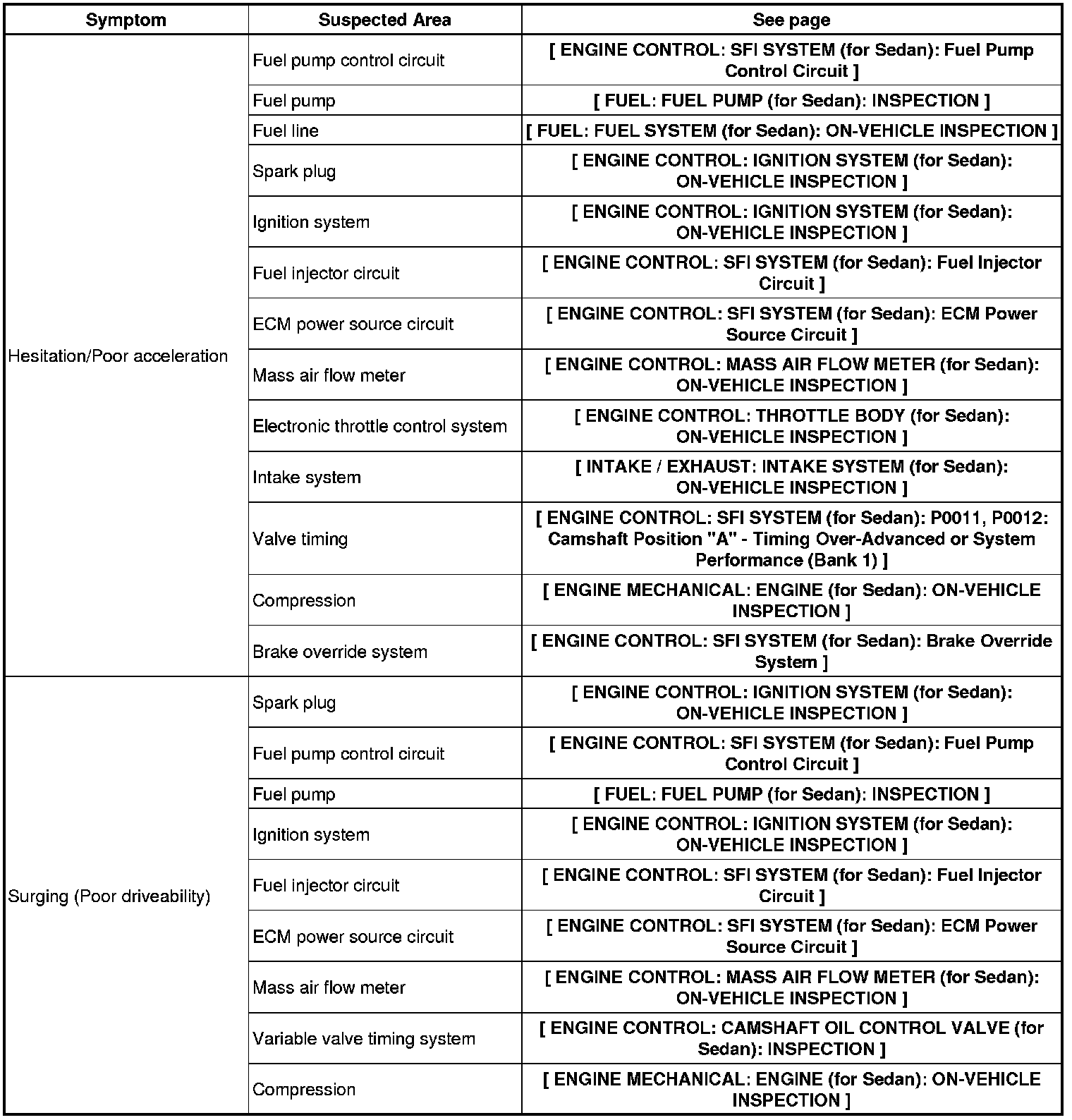 1NZ-FE ENGINE CONTROL: SFI SYSTEM (for Sedan): PROBLEM SYMPTOMS TABLE