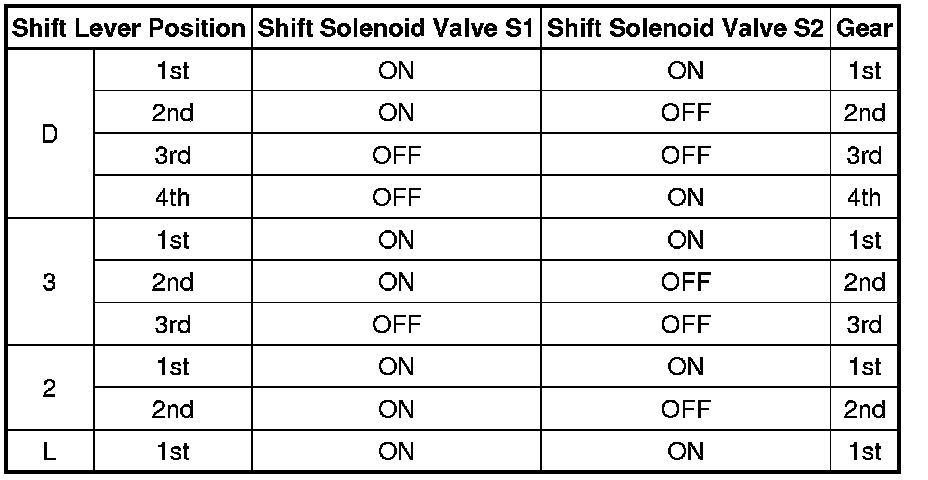 If either of the shift solenoid valve circuits develops an open or short, the ECM turns the other shift solenoid ON or OFF in order to shift into the gear positions shown in the table below.