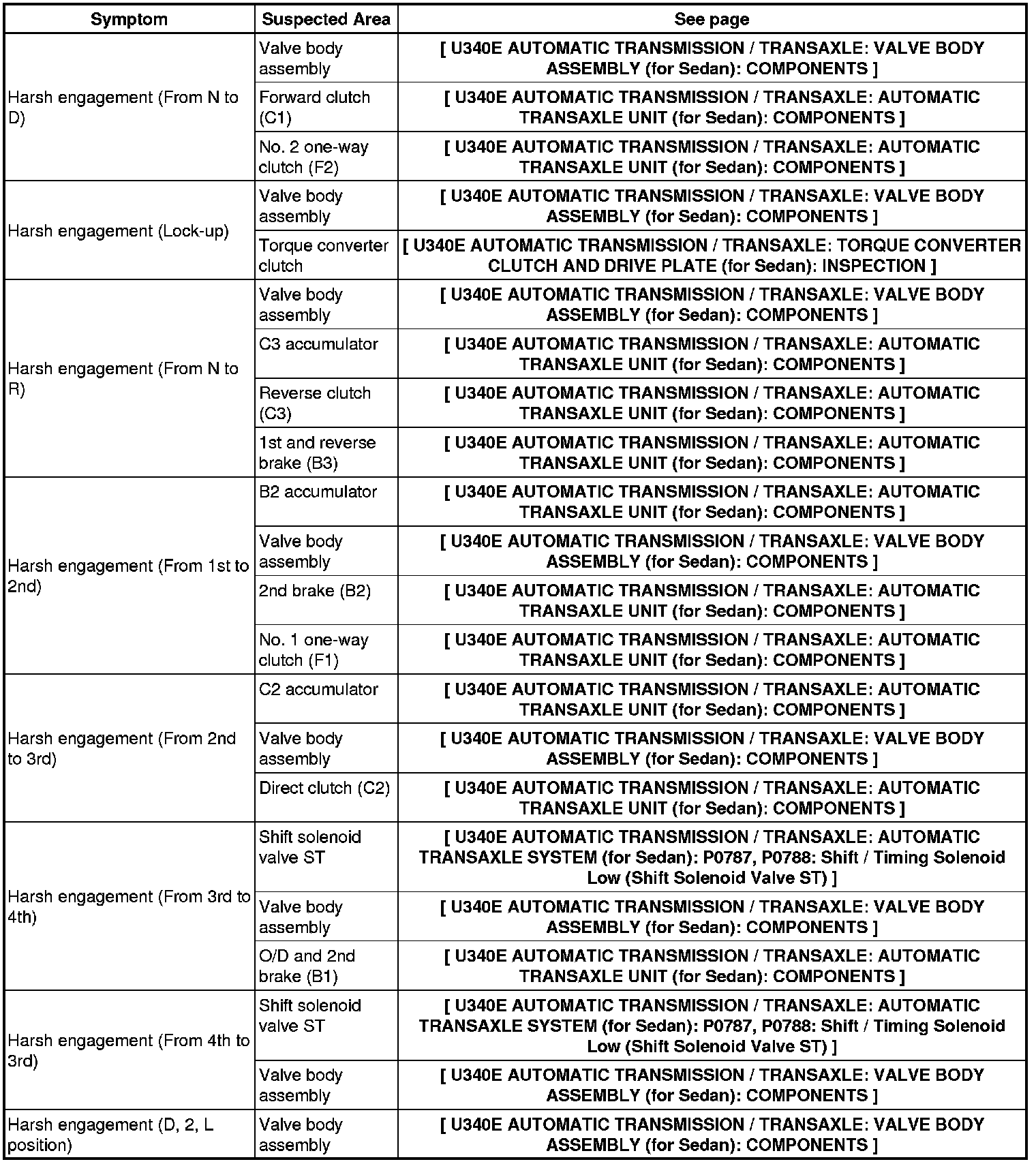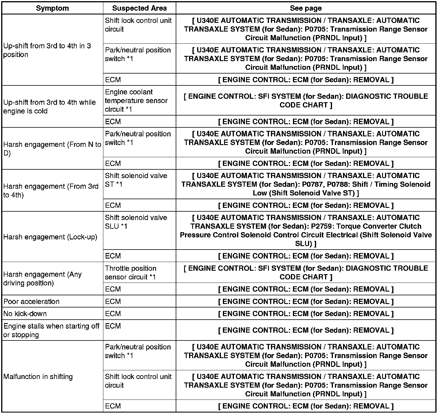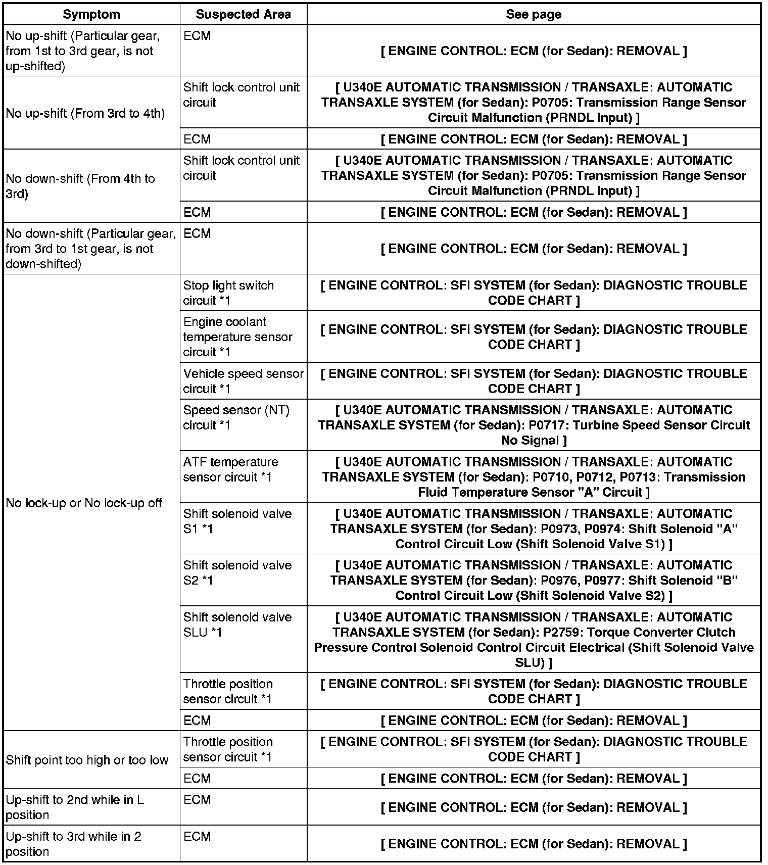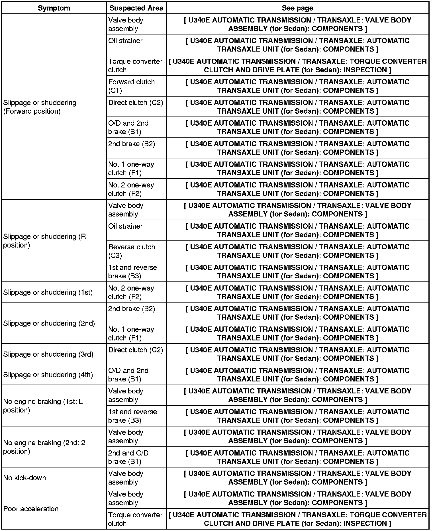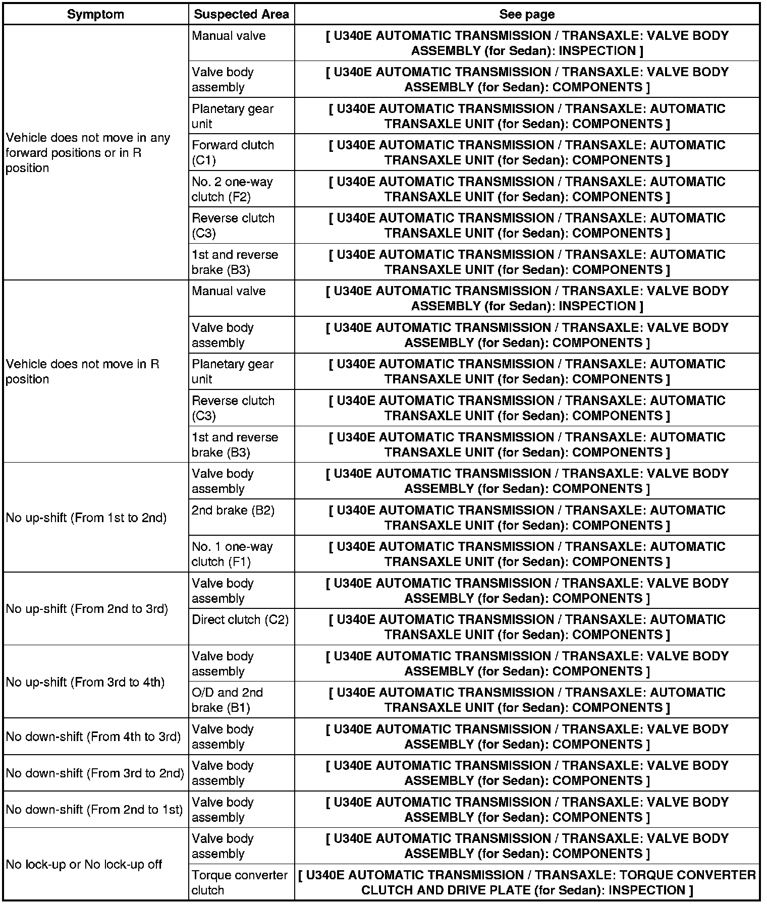 U340E AUTOMATIC TRANSMISSION / TRANSAXLE: AUTOMATIC TRANSAXLE SYSTEM (for Sedan): PROBLEM SYMPTOMS TABLE