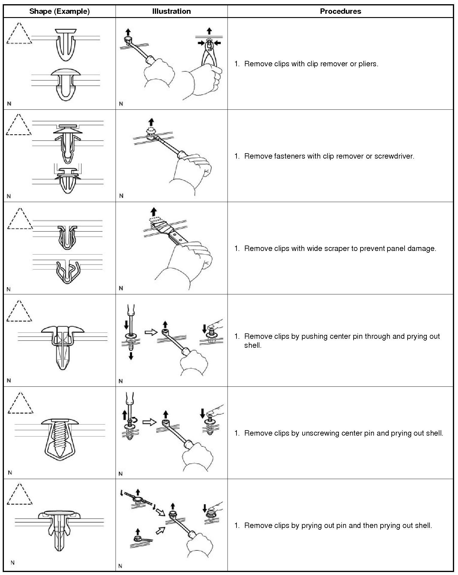 (1) The removal and installation methods of typical clips used for vehicle body parts are shown in the table below.