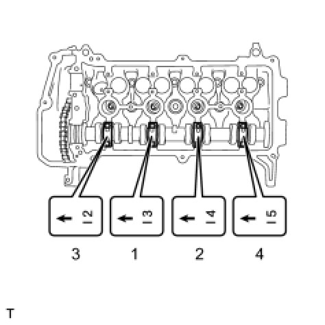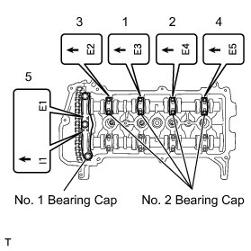 Uniformly tighten the bolts in several steps in the sequence shown in the illustration and install No. 1 camshaft bearing cap and No. 2 camshaft bearing cap.
