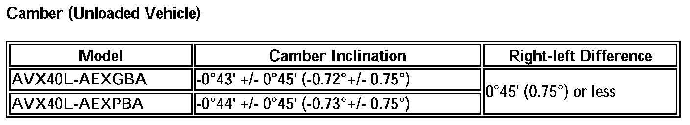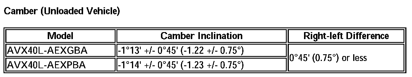 HINT: Camber is not adjustable. If the measurement is not within the specified range, inspect the suspension parts for damage and/or wear, and replace them if necessary.