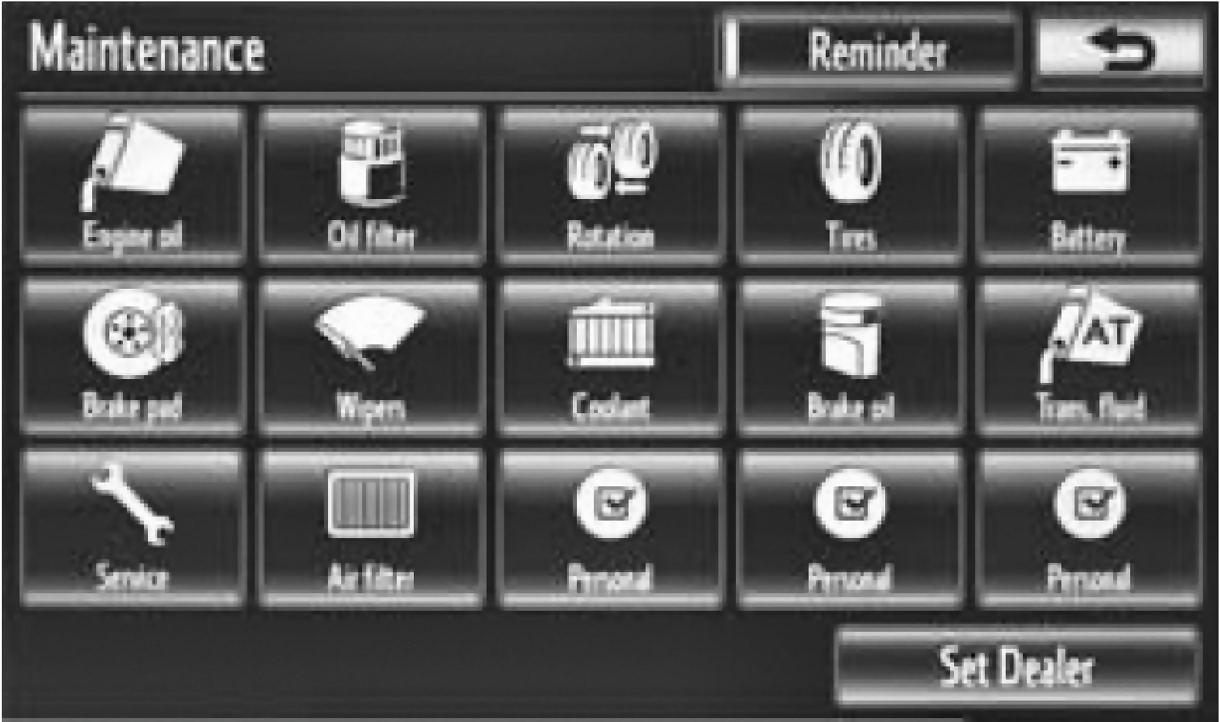 "Reminder": When this button is touched, the indicator is illuminated. The system is set to give maintenance information with the "Maintenance Reminder" screen.