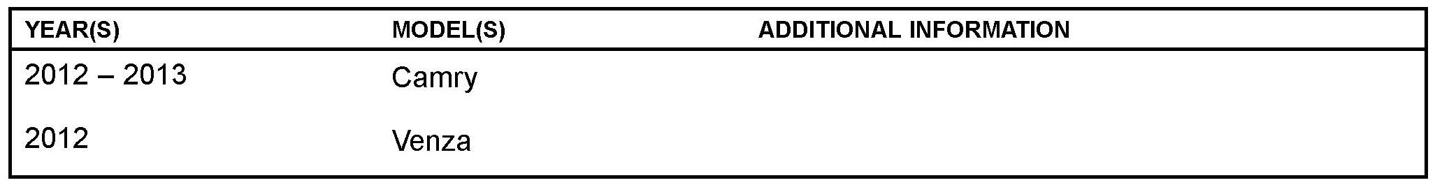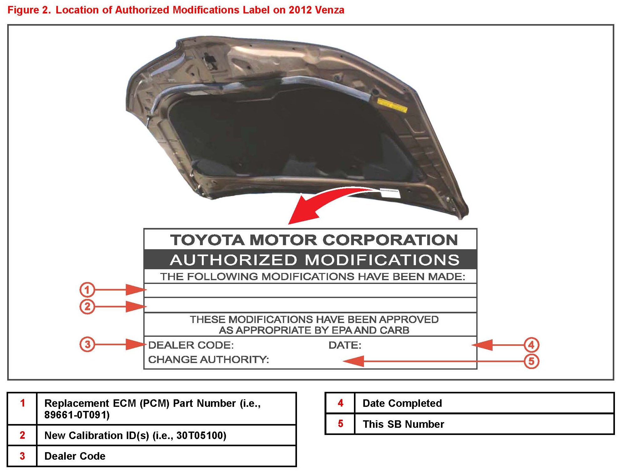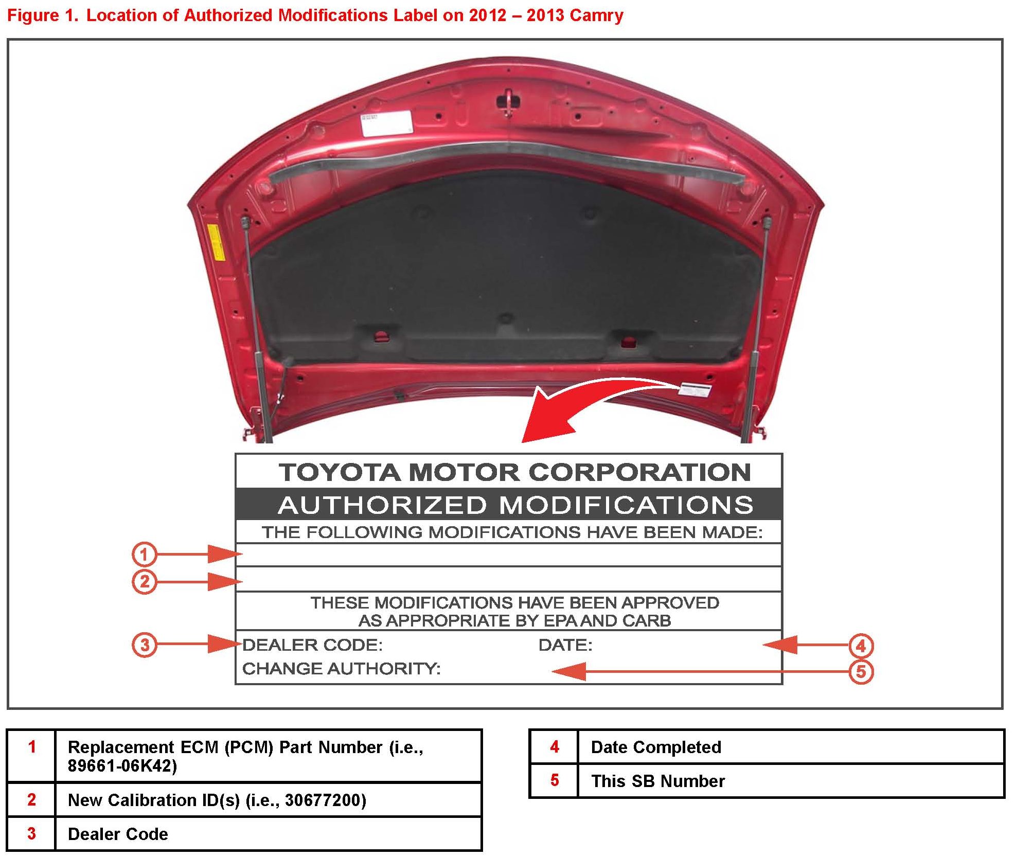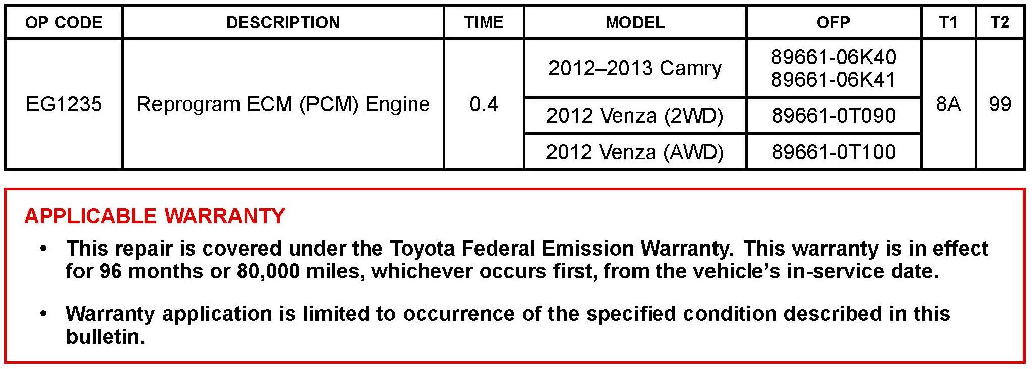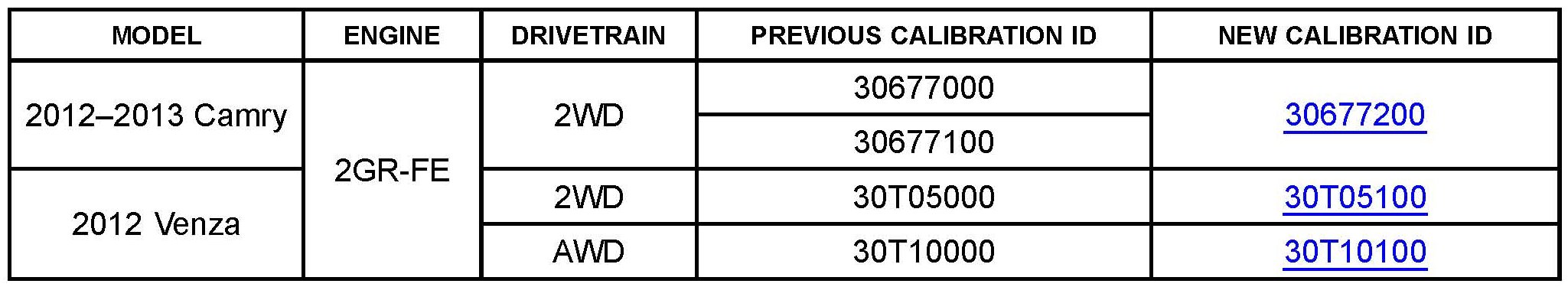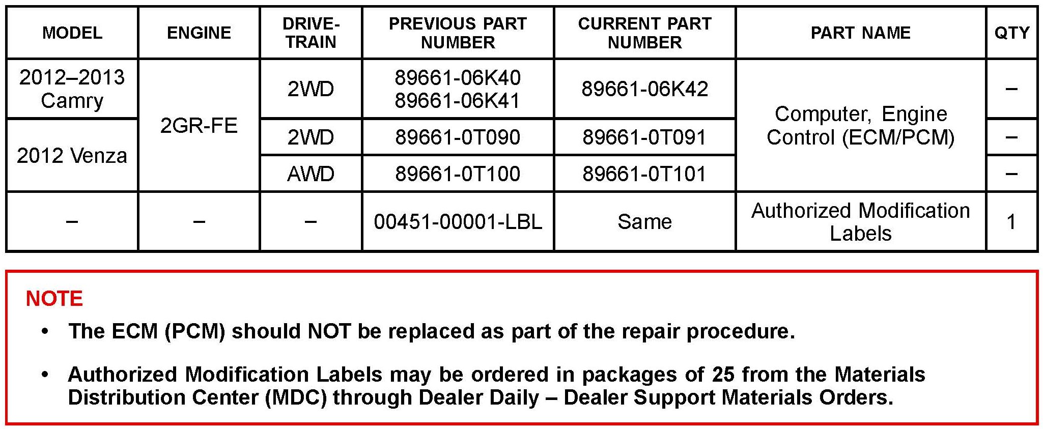 Some 2012 - 2013 model year Camry and 2012 model year Venza vehicles equipped with 2GR-FE engines may exhibit a MIL "ON" condition with Diagnostic Trouble Code (DTC) P219A or P219B present. The Engine Control Module/ECM (SAE term: Powertrain Control Module/PCM) logic has been modified to reduce the possibility of this condition occurring. Please follow the repair procedure below to address this condition.