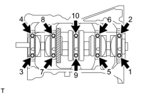 (a) Uniformly loosen and remove the 10 main bearing cap bolts in the sequence shown in the illustration.