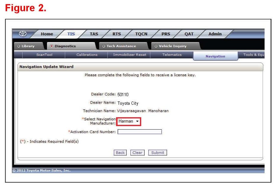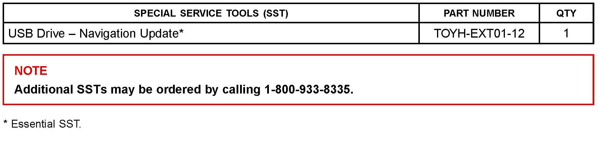 Toyota models equipped with the Display Audio HDD Navigation System require a Special Service Tool (SST) USB drive to update the map, points of interest, Gracenote(R), and system software. The SST is used with all vehicles to deliver the update, however a unique Activation Number is required for each vehicle. Activation Numbers are provided in an Activation Card Number (ACN) pamphlet available through the normal parts ordering system. Use the process described in this bulletin to perform the update.