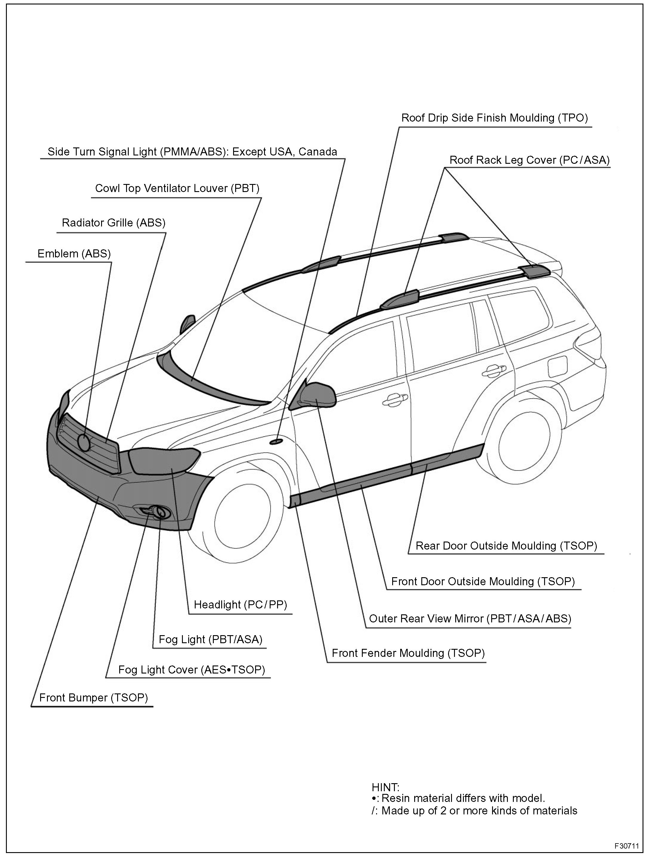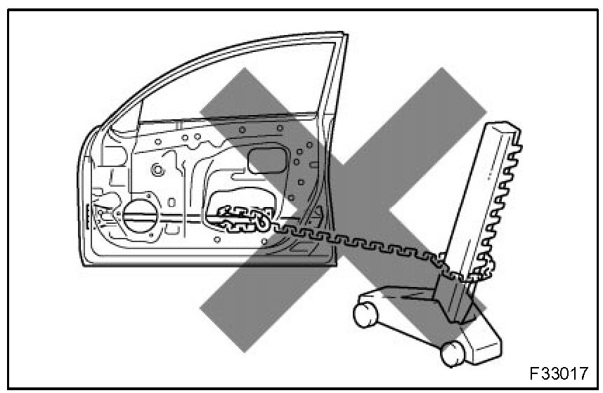 1. Rustproof high strength steel sheets are used for the body frame. Therefore, if these parts are heat repaired using an acetylene torch or equivalent, the crystalline structure changes, causing the strength of the steel sheets to decrease. Also, the zinc coating which is used to protect the body from rust will be damaged. This causes the surface of the steel sheets to become oxidized, which reduces their ability to resist rust.