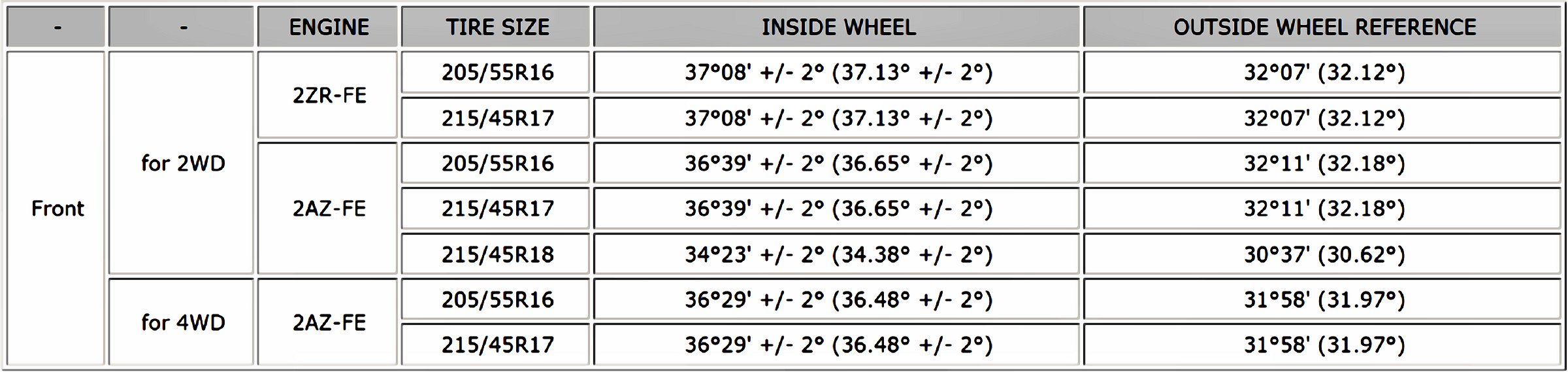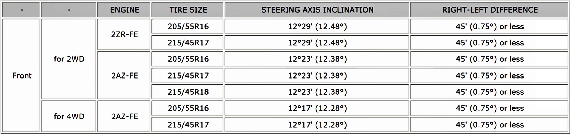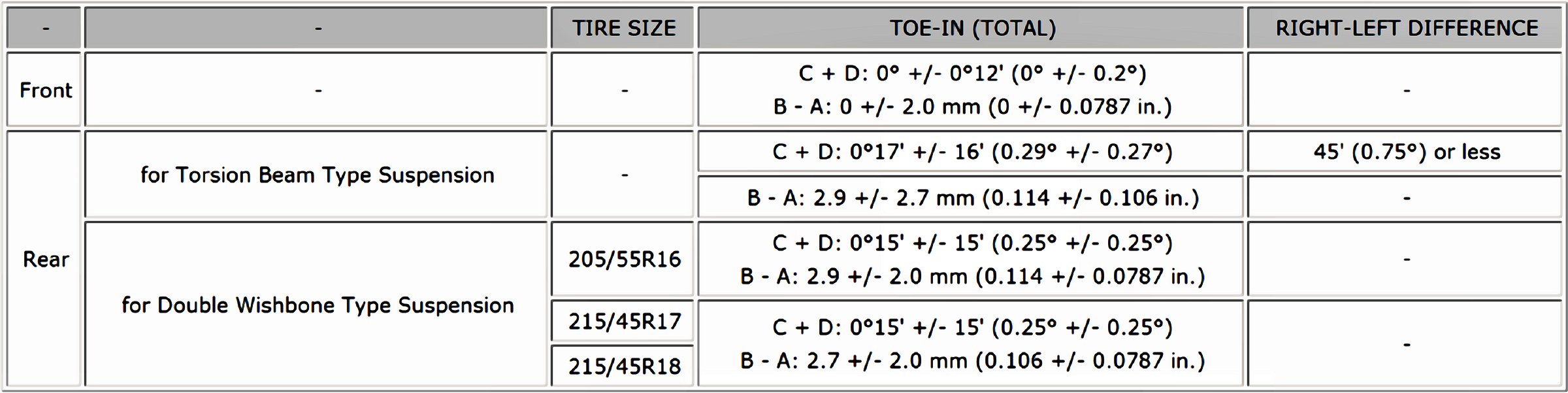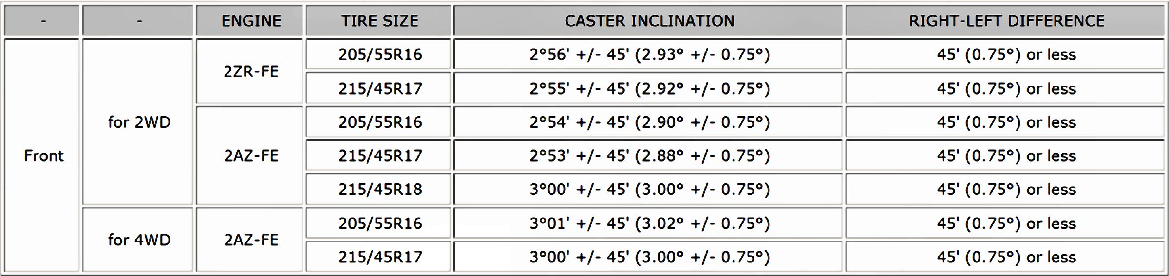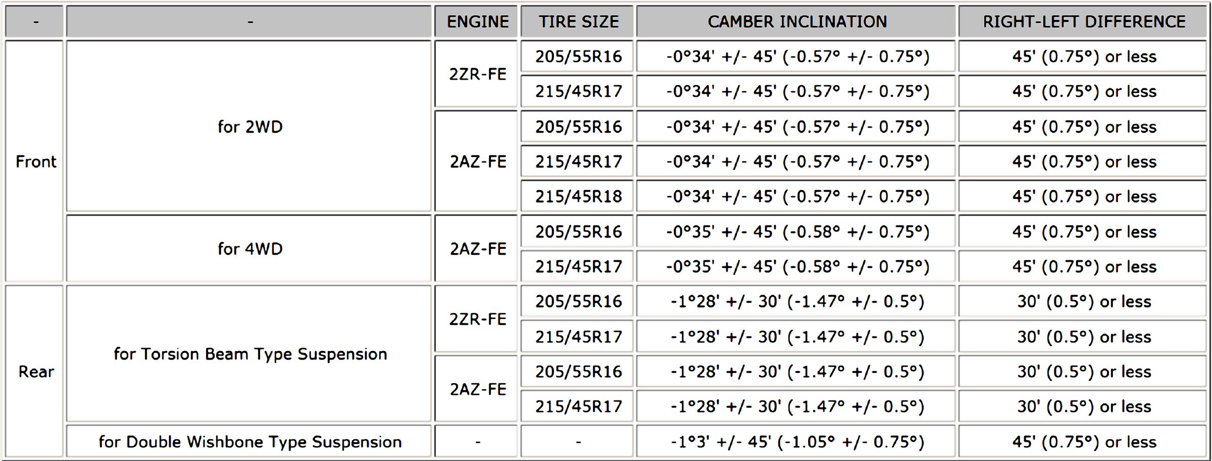 Wheel Alignment Specifications (Unloaded Vehicle)