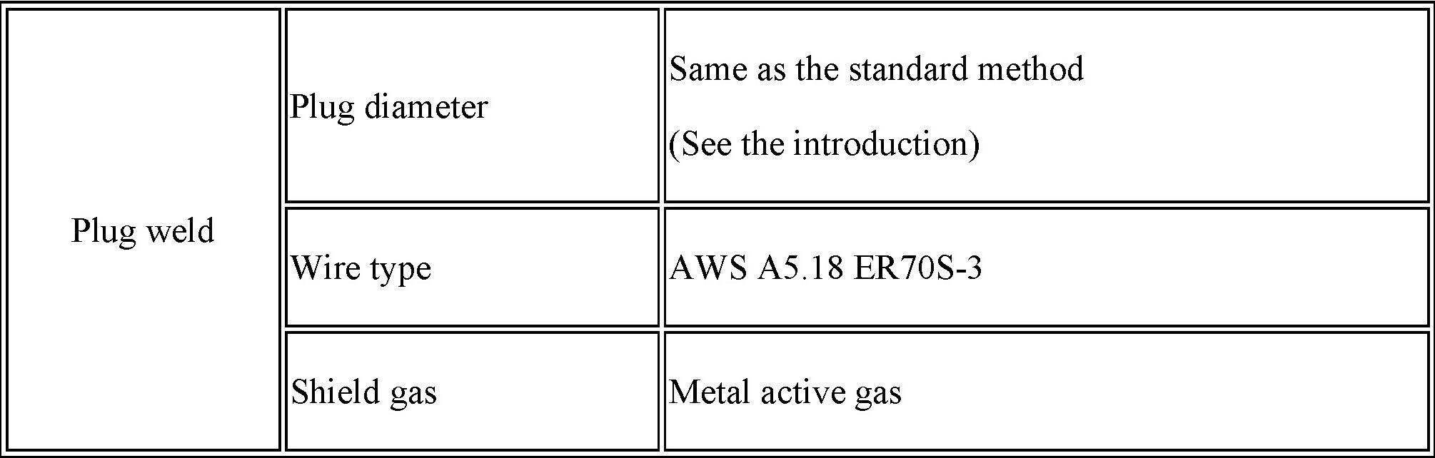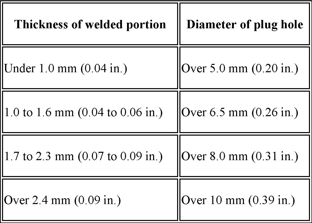 Be sure to use Metal active gas (Ar 80% + C02 20%) as the shield gas when plug welding. Sufficient weld strength cannot be assured when using 100% CO2 shield gas.