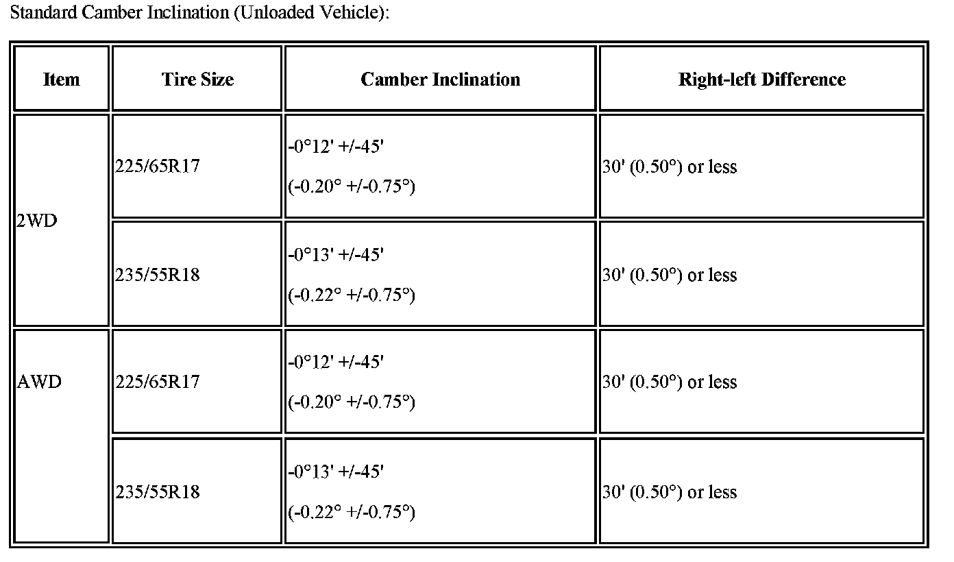 If the measured value is not within the specified range, inspect the suspension parts for damage and wear. Replace parts as necessary as the camber cannot be properly adjusted with any damaged or worn parts.