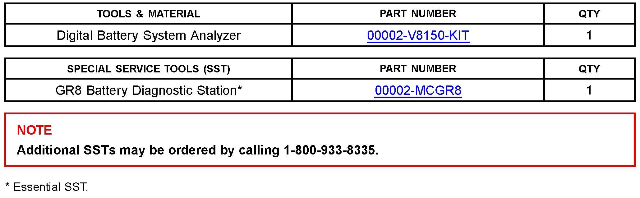^ Test batteries monthly (more often in high heat or cold areas), using the Digital Battery System Analyzer (P/N 00002-V8150-KIT). Refer to Service Bulletin No. PG001-06 "Battery Maintenance for In-Stock Vehicles and Pre-Delivery" for complete battery maintenance procedures.