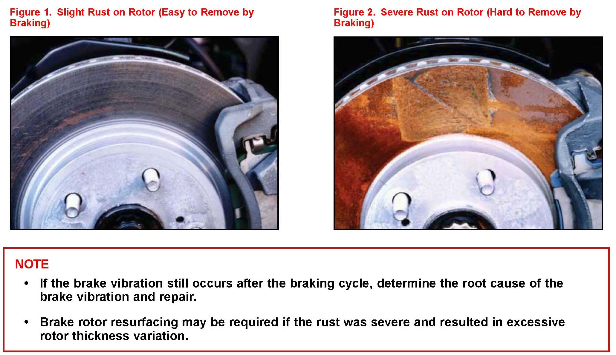 The brake rotors are made of cast iron, so they may show gradual build-up of surface rust during long term storage. At least once every two months, drive the vehicle and use the brakes normally stopping from about 30 mph at least 20 times. This regular usage will help prevent severe rust build-up and the possibility of unwanted brake vibration concerns due to rust.