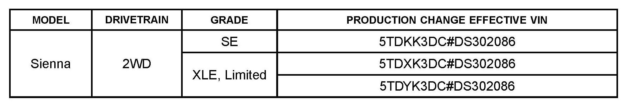^ 2013 MY Sienna vehicles equipped with Auto A/C produced BEFORE the Production Change Effective VINs shown.
