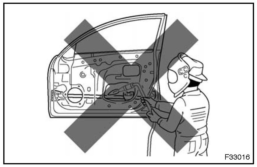 1. Rustproof high strength steel sheets are used for the body frame. Therefore, if these parts are heat repaired using an acetylene torch or equivalent, the crystalline structure changes, causing the strength of the steel sheets to decrease. Also, the zinc coating which is used to protect the body from rust will be damaged. This causes the surface of the steel sheets to become oxidized, which reduces their ability to resist rust.