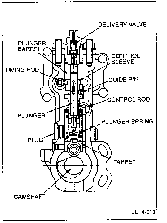 When the suction port and the notched groove (lead) of the plunger are connected with the spill port of the control sleeve, the high pressure fuel in the pressure chamber is drained through the spill port to the fuel chamber, and this completes the fuel feed.