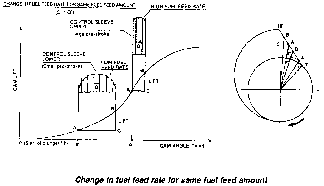When the control sleeve is at the top, the pre-stroke is at its maximum, and as the plunger lift speed is fast, the fuel feed time can be made shorter. This means that the amount of fuel fed per unit time is larger and the fuel feed rate is higher.